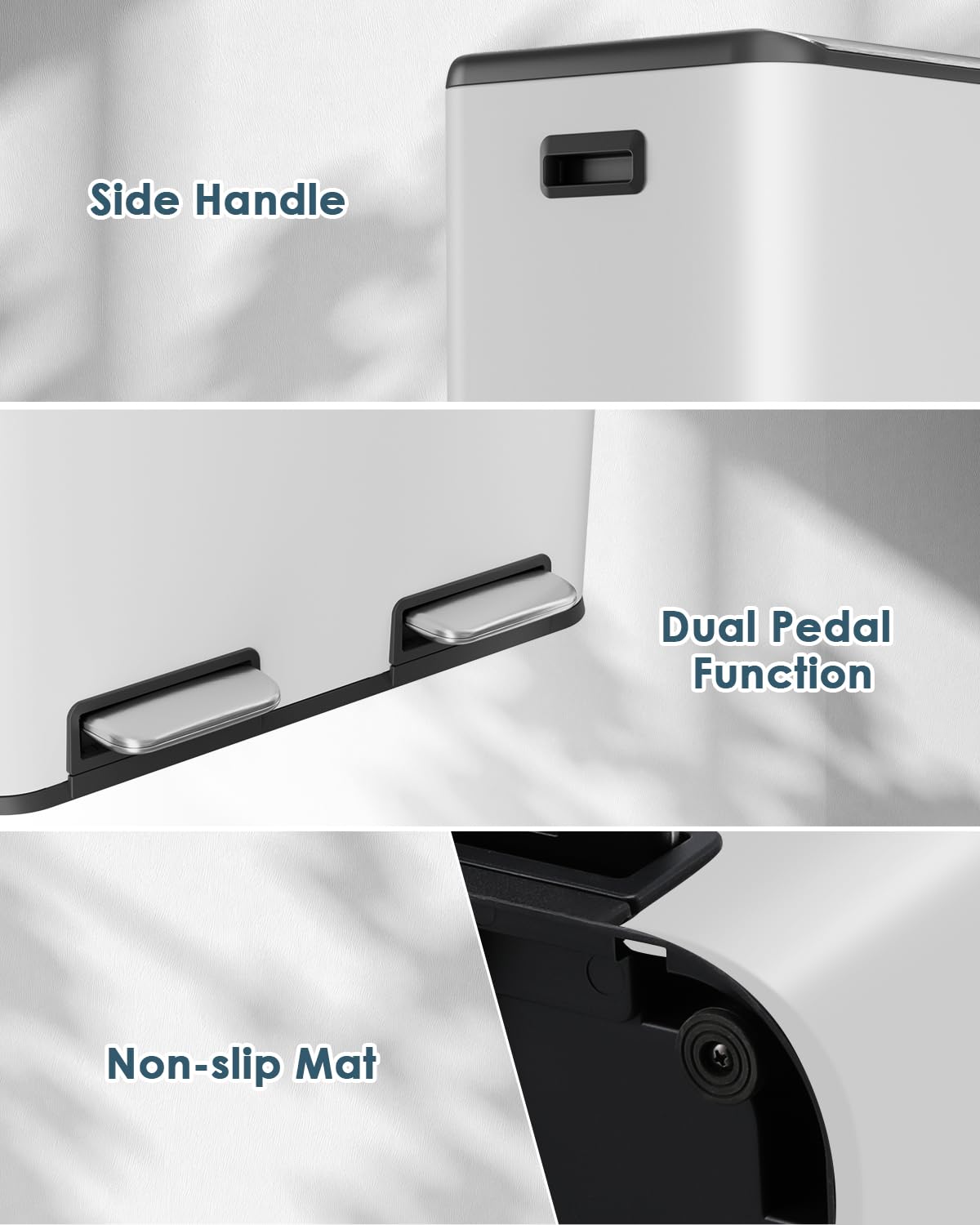 - Dual 8 gallon Compartment Bins: Trash can measures 20.3in * 14.6in * 26.2in. With a large capacity of 60 liters, it offers plenty of room for garbage and recycling, Combo garbage bin comes with two removable inner barrels, and each compartment has an independent lid and a widened pedal, which effectively isolates the smell of garbage and facilitates the opening of each compartment.