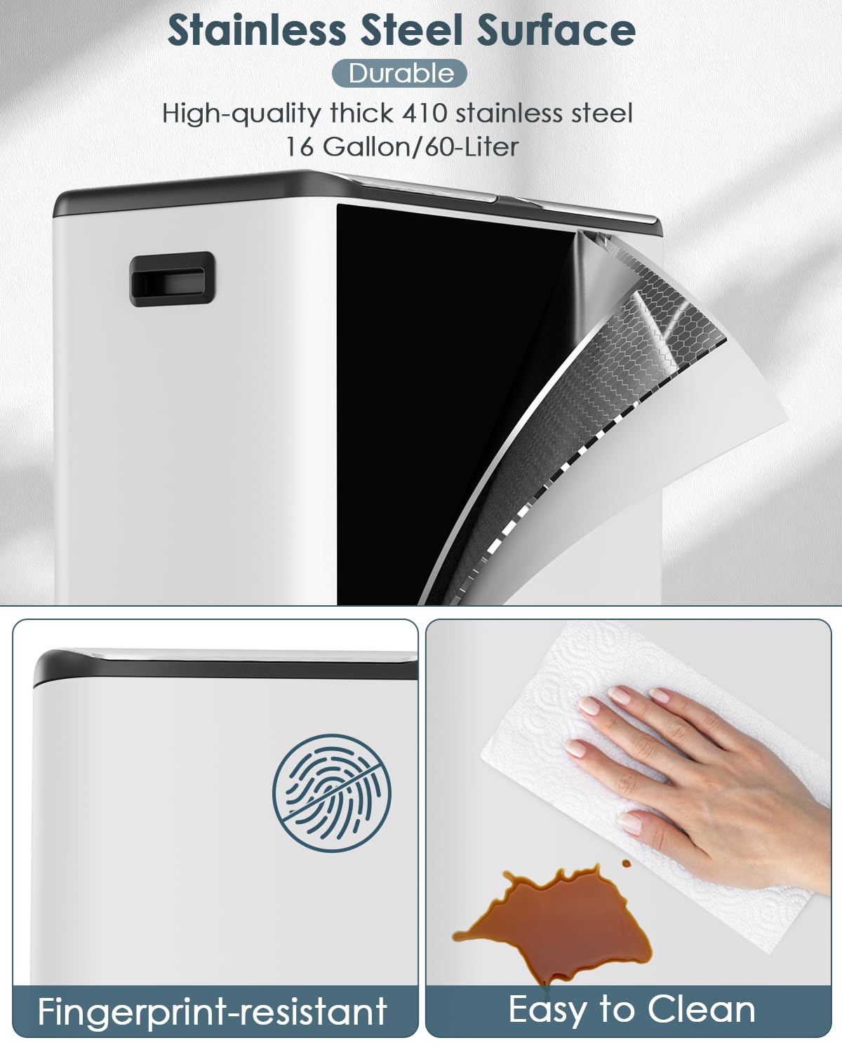 Arlopu 16Gal Dual Trash Can w/2 Built-in Box for Odor Control, Hands-Free Kitchen Garbage Bin, Recycle Waste Dustbin, Soft-Close Lid, 2 Buckets,Foot Pedal, Side Handle, Airtight,for Home Office