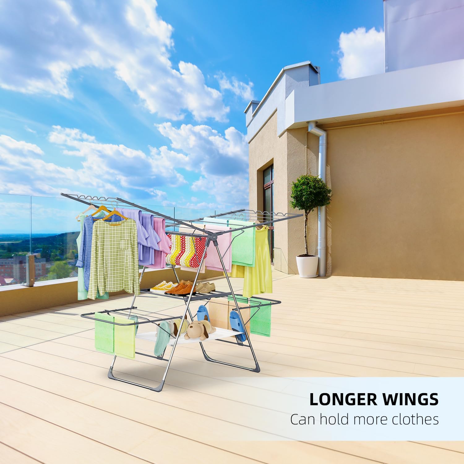 - 【4 Wings, 33 Rails, Multiplied Space】Designed over two tiers, this folding laundry drying rack can be placed on the floor, countertop, or even in the bath if you are pushed for space, to ensure your clothes dry as quickly and thoroughly as possible. With 4 wings in 2 layers for a total of 33 rails, this clothes drying rack offers you tons of space to dry your clothes, towels, your kids'clothes, and blankets, perfect for those who want to dry lots of clothes at once. NOTE:Free 10 clothes clips included.