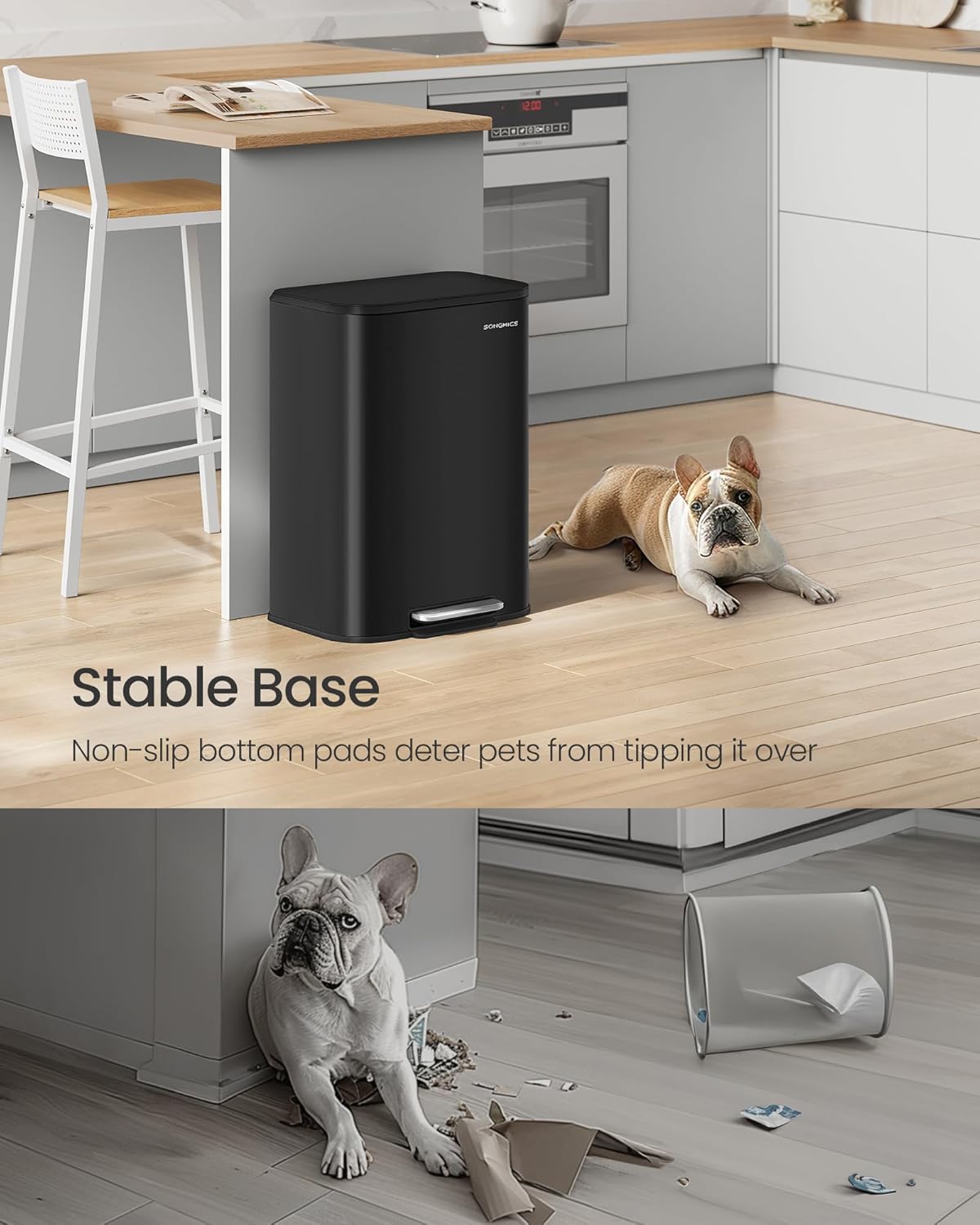 - [Durable and Stable] Made from robust stainless steel, this trash bin is resistant to rust, dirt, and is easy to clean. The base is equipped with non-slip pads to enhance stability, making it difficult for pets to tip it over