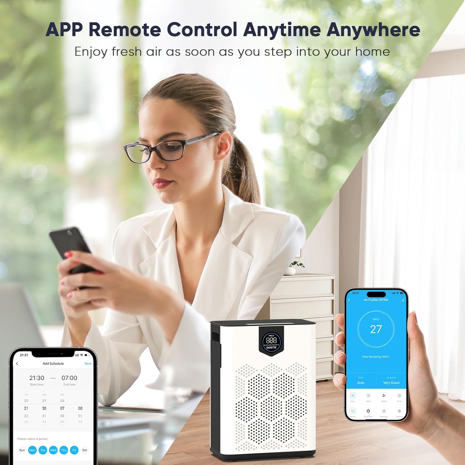 - 【𝐒𝐦𝐚𝐫𝐭 𝐂𝐨𝐧𝐭𝐫𝐨𝐥 𝐟𝐨𝐫 𝐀𝐧𝐲𝐭𝐢𝐦𝐞, 𝐀𝐧𝐲𝐰𝐡𝐞𝐫𝐞】Remotely master your air purifier via our Smart Home Life app, compatible with 2.4GHz Wi-Fi, for control unhindered by time or distance. Monitor your indoor air quality in real-time, turning off/on, changing modes or fan speed, creating a schedule, using a timer, track filter usage, and reorder replacements filter. Start it when you get off work and enjoy fresh air as soon as you get home