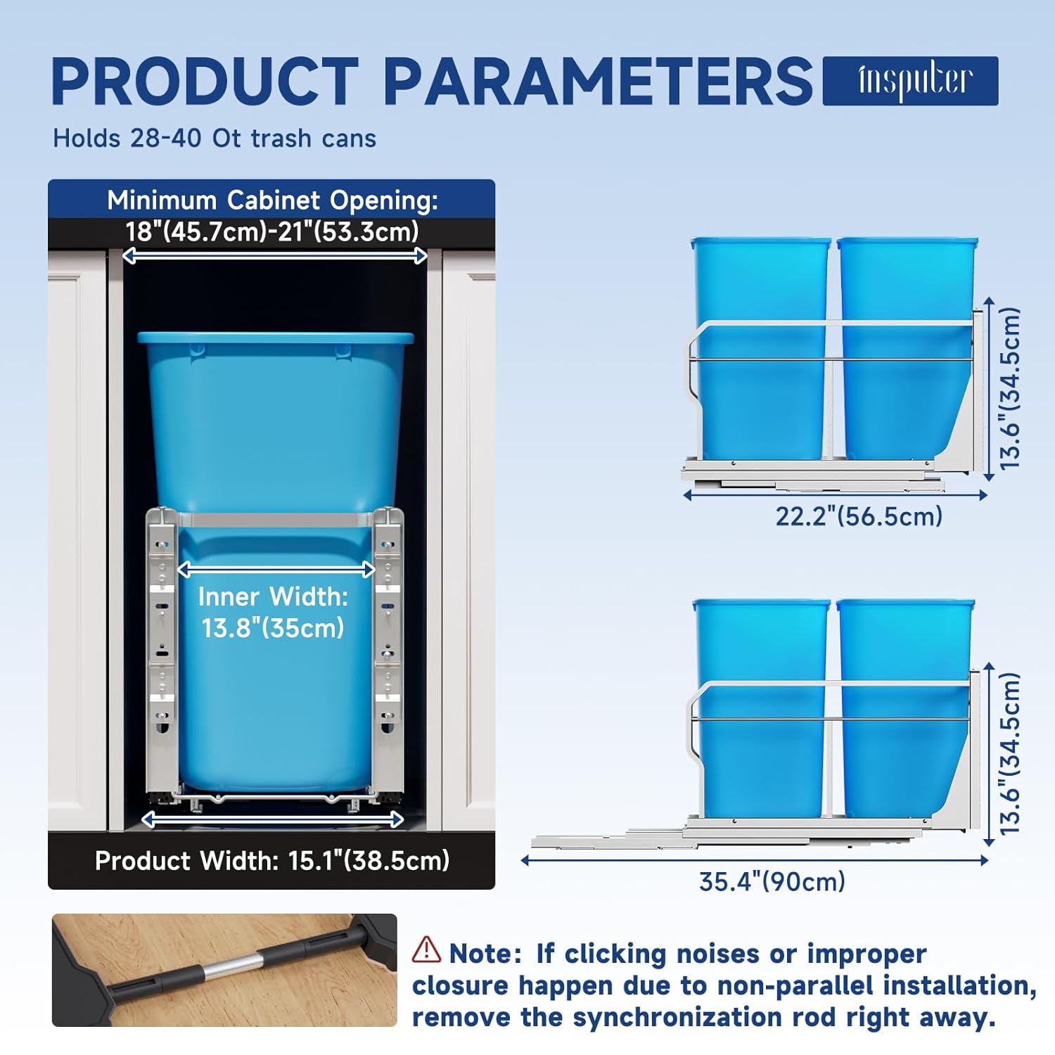 - Soft-closing slides: Don't worry about damaging your cabinets by pushing hard on the doors! Insputer cabinet trash can pullout kit uses better quality damping slides with soft closing function, which has great advantages in reducing noise and running smoothly