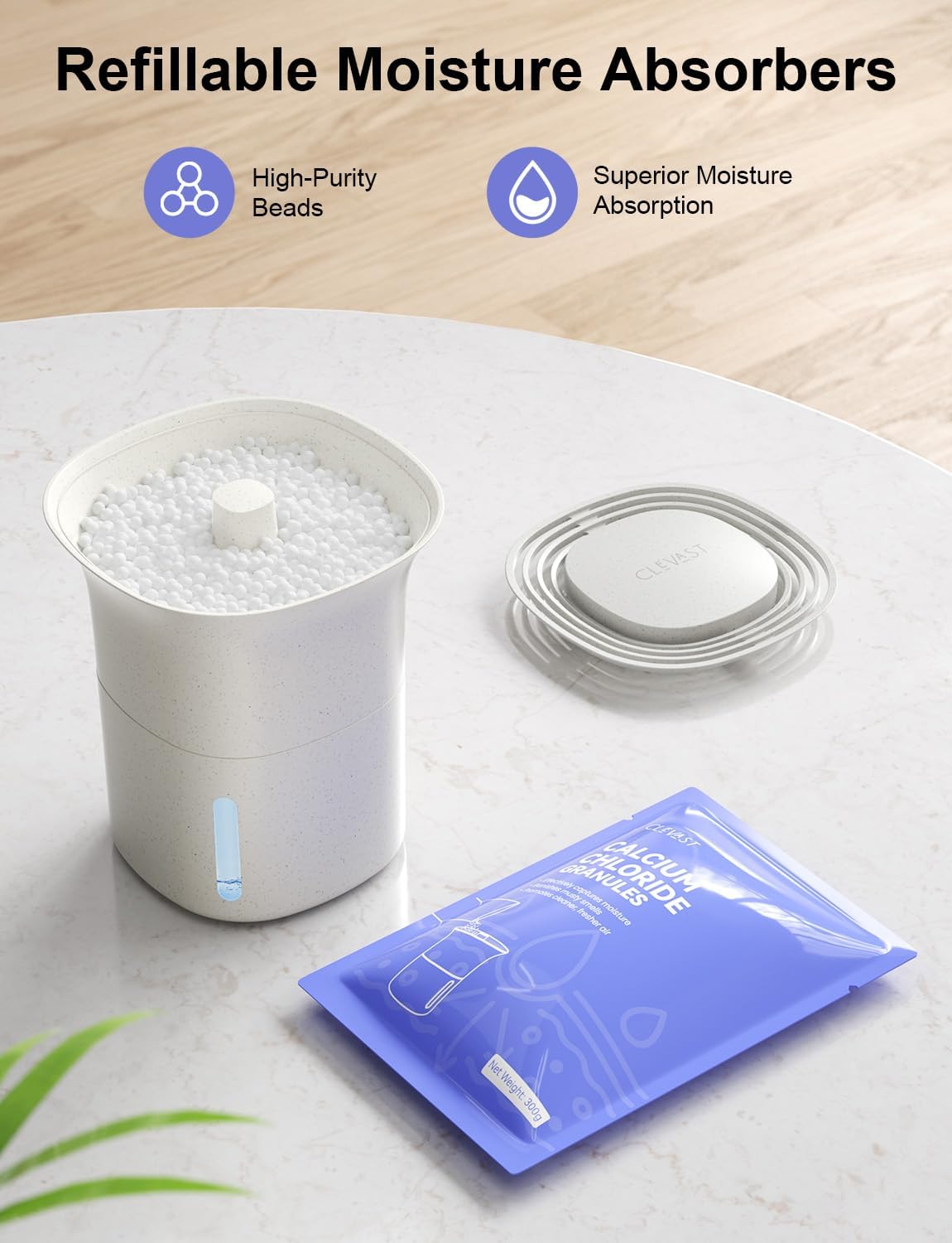 - REFILLABLE MOISTURE ABSORBERS: The moisture-absorbing cup, crafted from durable ABS and wheat straw, is reusable and sturdy. Once the dehumidifying pellets are depleted, it can be refilled with CLEVAST calcium chloride granules(ASIN: B0DWFBV35B).