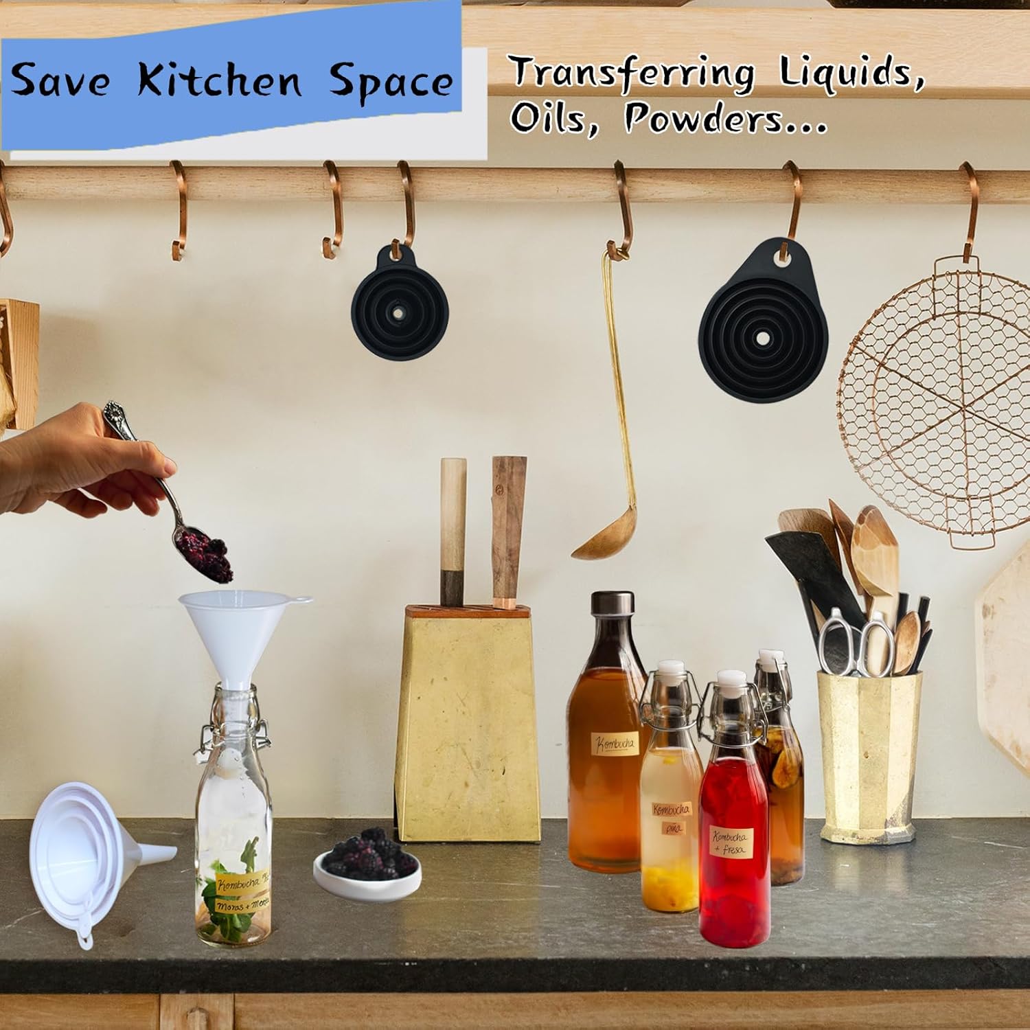 - 6 Piece Oil Funnel - Use our funnels to easily transfer dry or liquid ingredients while keeping kitchen counters leak-free. The plastic funnel is available in 4 different sizes, large,middle, samll and mini funnels for filling small bottles, and the silicone collapsible funnel is available in two sizes, which can fully meet the daily needs of the family.