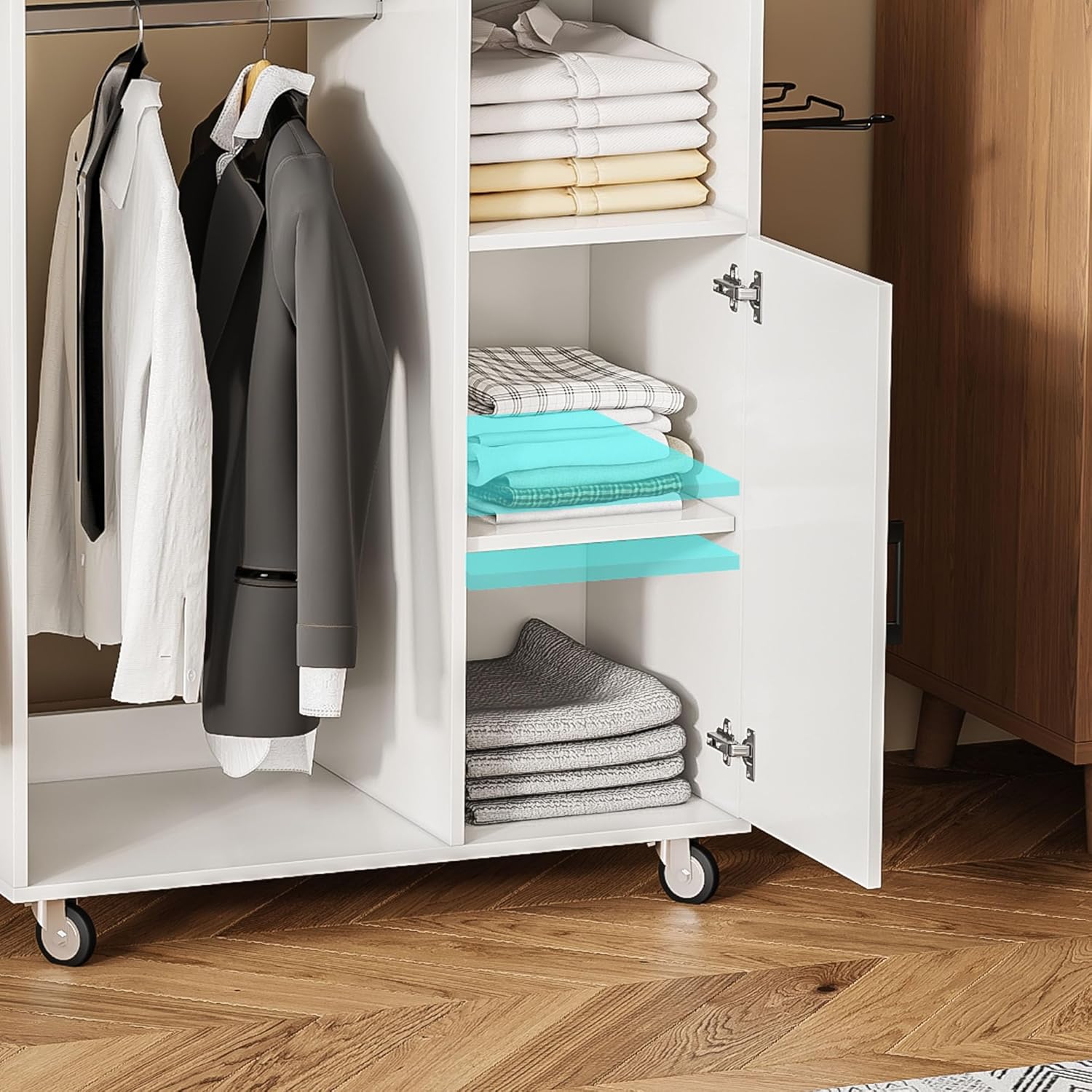 - Adjustable Shelf Height: Customize your storage needs with the adjustable internal partition in the closed compartment, which can be set to three different heights. This flexibility makes the ironing cart a versatile solution for managing your laundry supplies. Wheels can be fixed