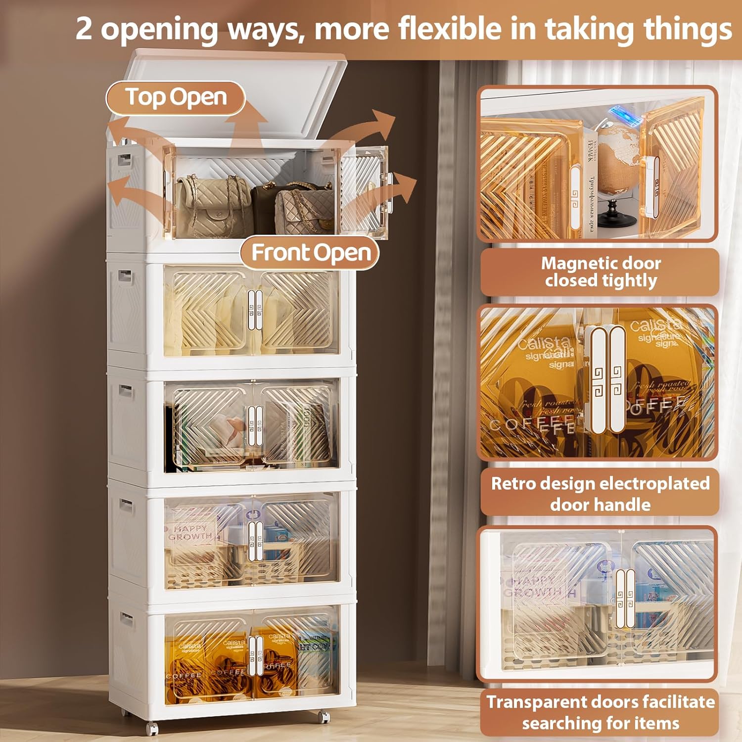 - 【Double Door & Visual Design】The storage boxes can be opened from the front doors and the top lid, 2 opening ways are convenient for retrieving items from different directions. The top lid makes it easy to quickly access large items, such as clothes and blankets. Powerful magnets are built into the front door to ensure that it will not automatically open. The door is made of transparent material, making the clear storage bins visible, so you can quickly find the items you need and save your time