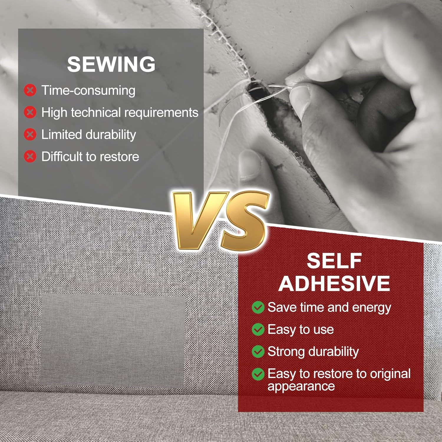 - Advantage: Made of quality PVC leather, compared with PU leather, it has better performance in waterproof, wear resistance, and breathability, which improves the application and maintenance results. No need to heat, iron, or sew, just tear off and stick, this self-adhesive leather patch can complete your repair project in seconds.