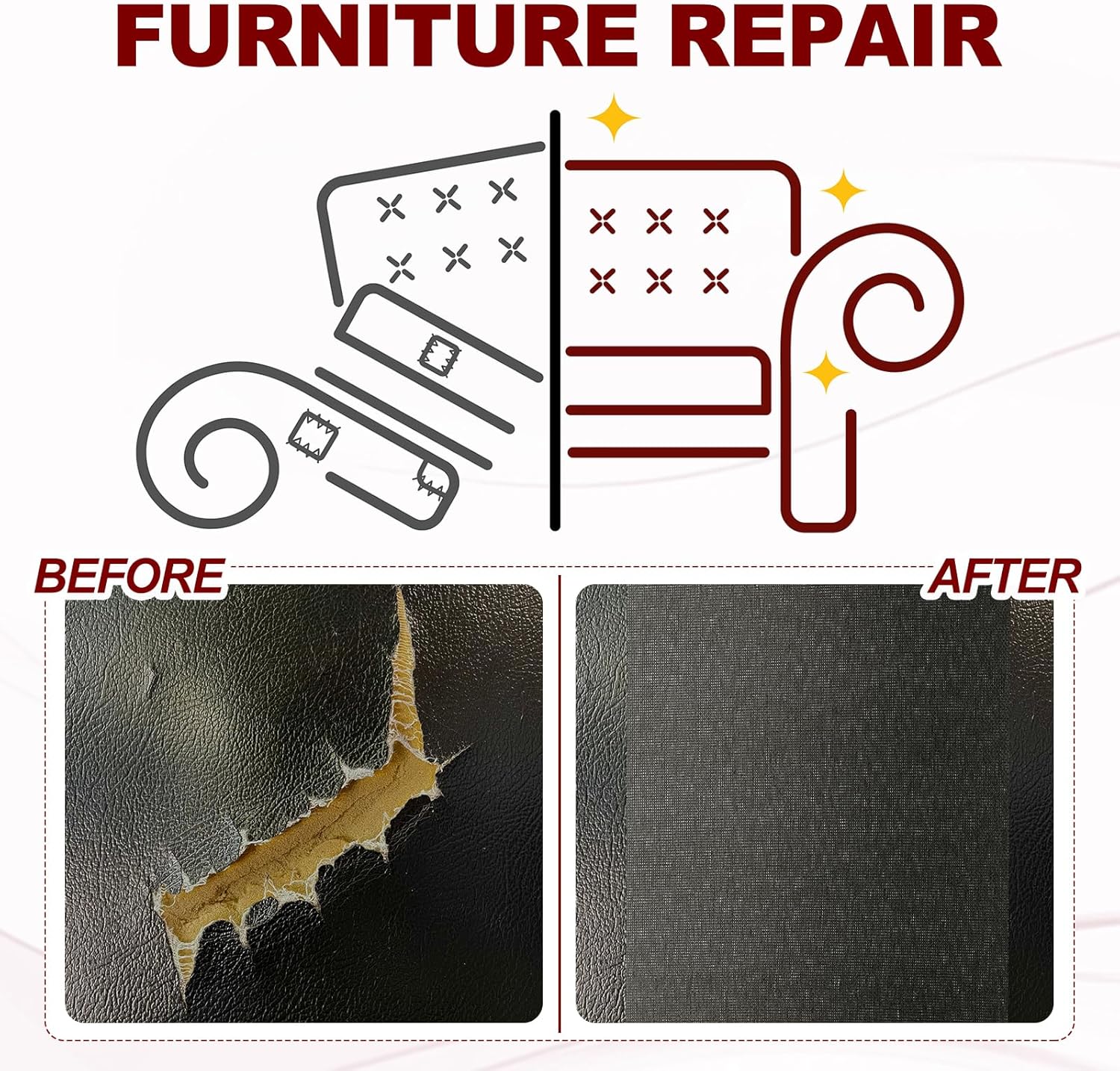 - Application: Soft, wear-resistant, high temperature resistant, waterproof, scratch-resistant, and durable PVC leather repair patches can be used to repair scratches, tears, holes, burning marks, and pet scratches on various leather products. Widely used in sofas, chairs, car seats, bags, wallets, boots, jackets, belts, belts, gloves, recliners, leather jackets, and DIY handmade and other leather products.