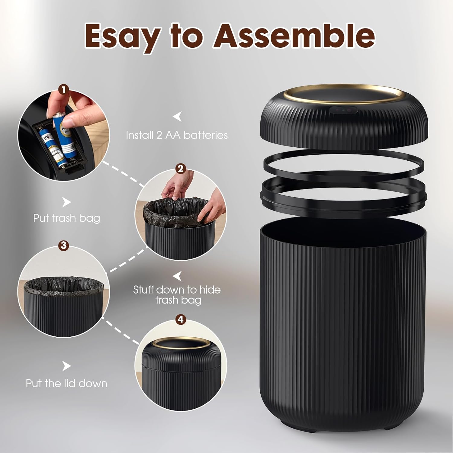 - Touchless Trash Can: Procade small trash can for bathroom use advanced automatic sensing technology, its lid opens when your hand or any object is detected in the sensing area, eliminating the need for direct contact. When your hand leaves, the lid closes automatically after 5 seconds. Requires 2 AA batteries (not included)