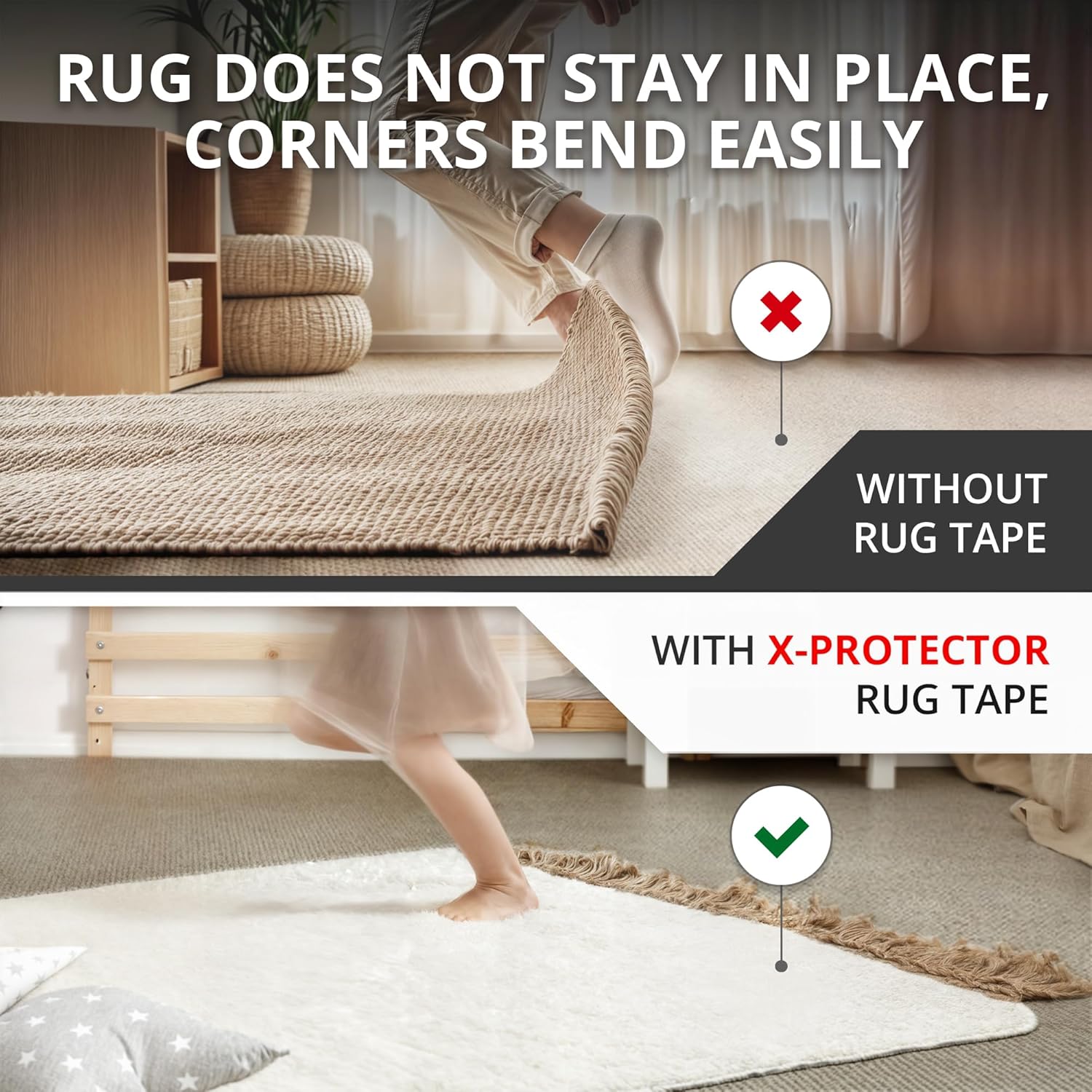 - ✌️ Are you fed up with sliding rugs or rug corners interfering when you’re walking? Forget about it! Keep your rugs in place and make flat corners with carpet tape for area rugs by X-Protector!