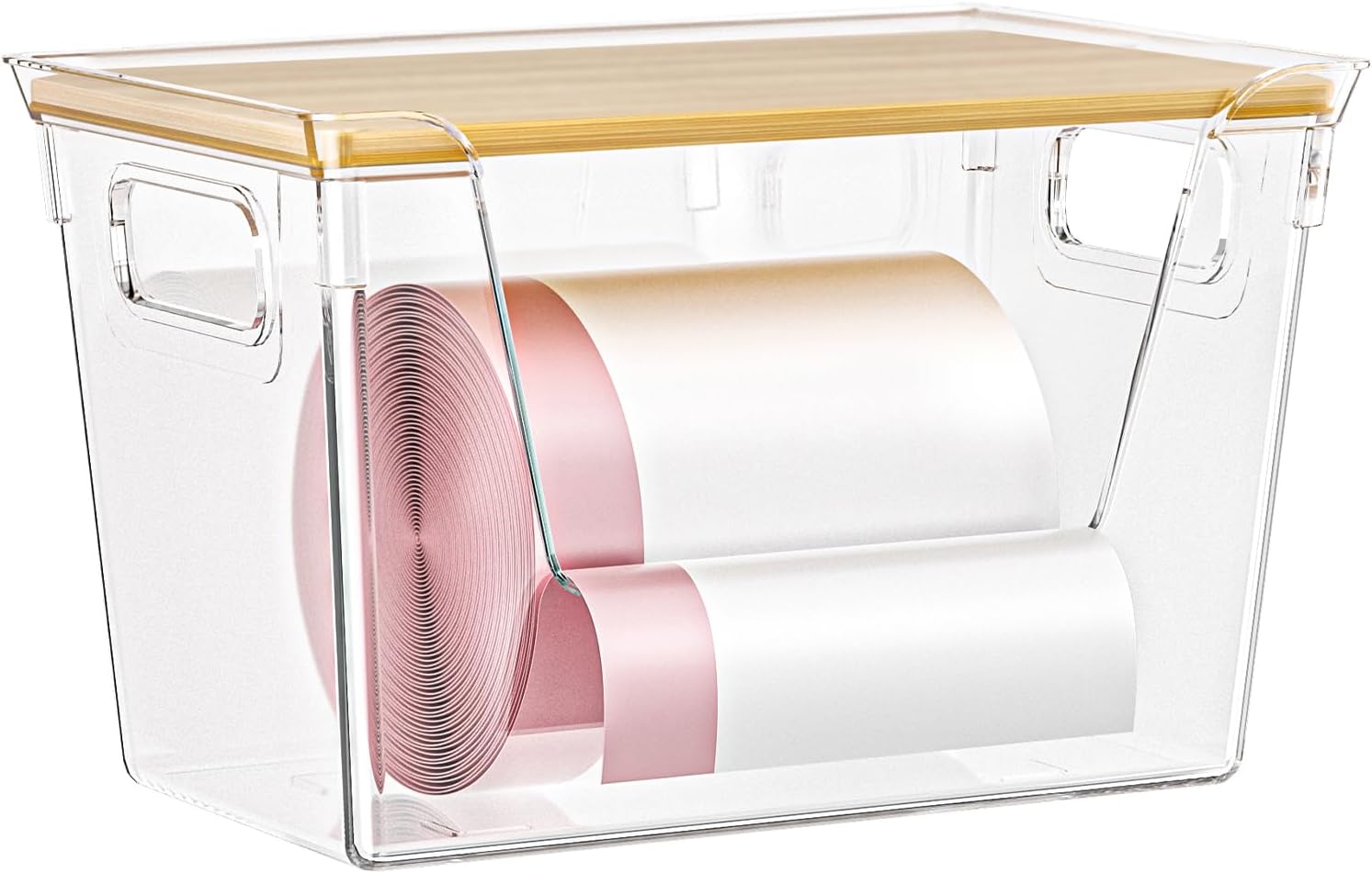 - High-Quality Materials: The top of the garbage bag dispenser is made from 100% natural bamboo, free from BPA. The under-sink trash bag dispenser is constructed from thick transparent plastic and PET materials, which are sturdy, shatterproof, scratch-resistant, and transparent. This allows you to quickly find what you need while keeping everything clean and dust-free