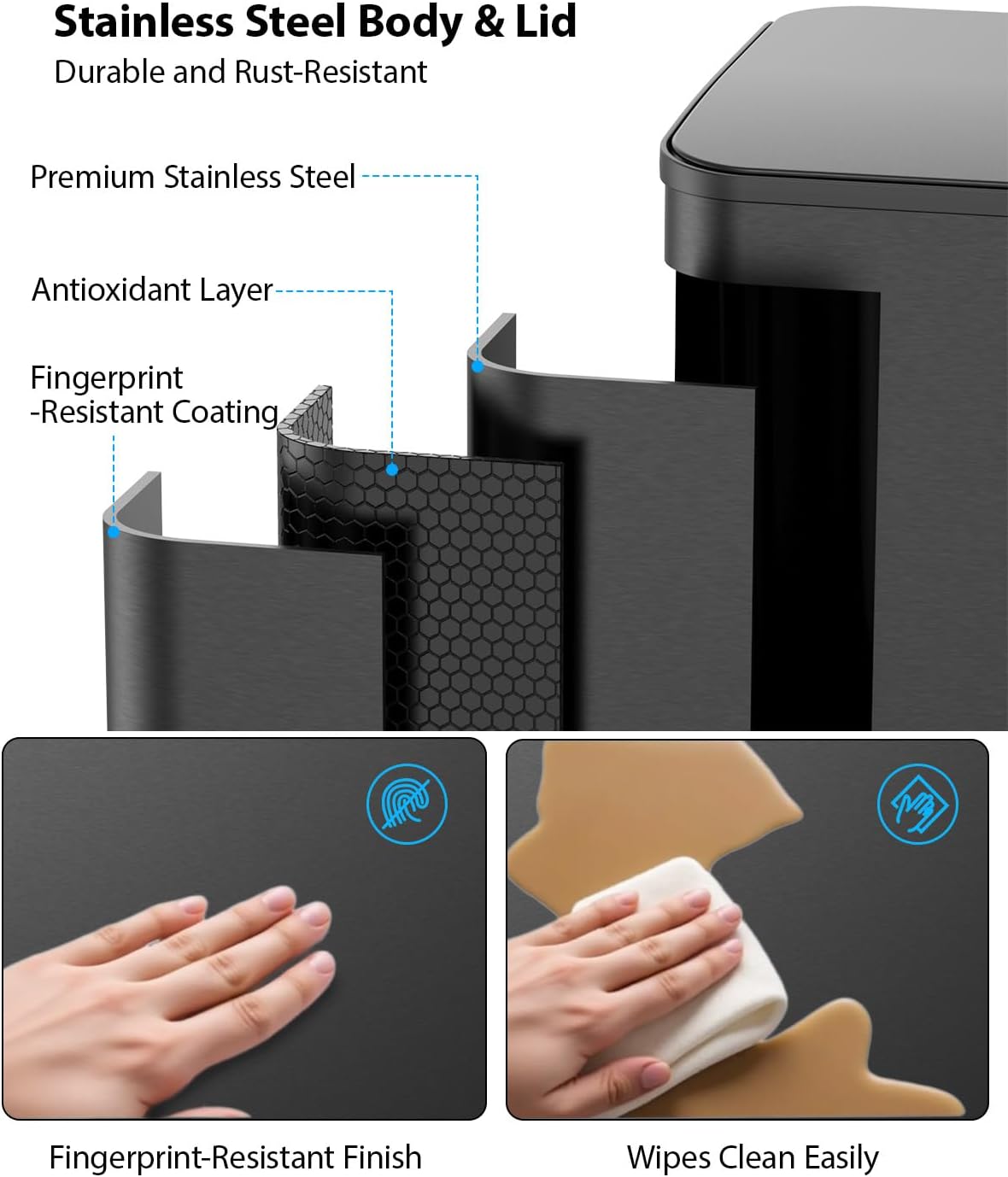 - Hands-Free Operation: Our kitchen garbage can features durable stainless steel pedals for hands-free trash disposal. The stainless steel foot pedal has a service life of over 200,000 times, that's more than 20 steps a day for 30 years