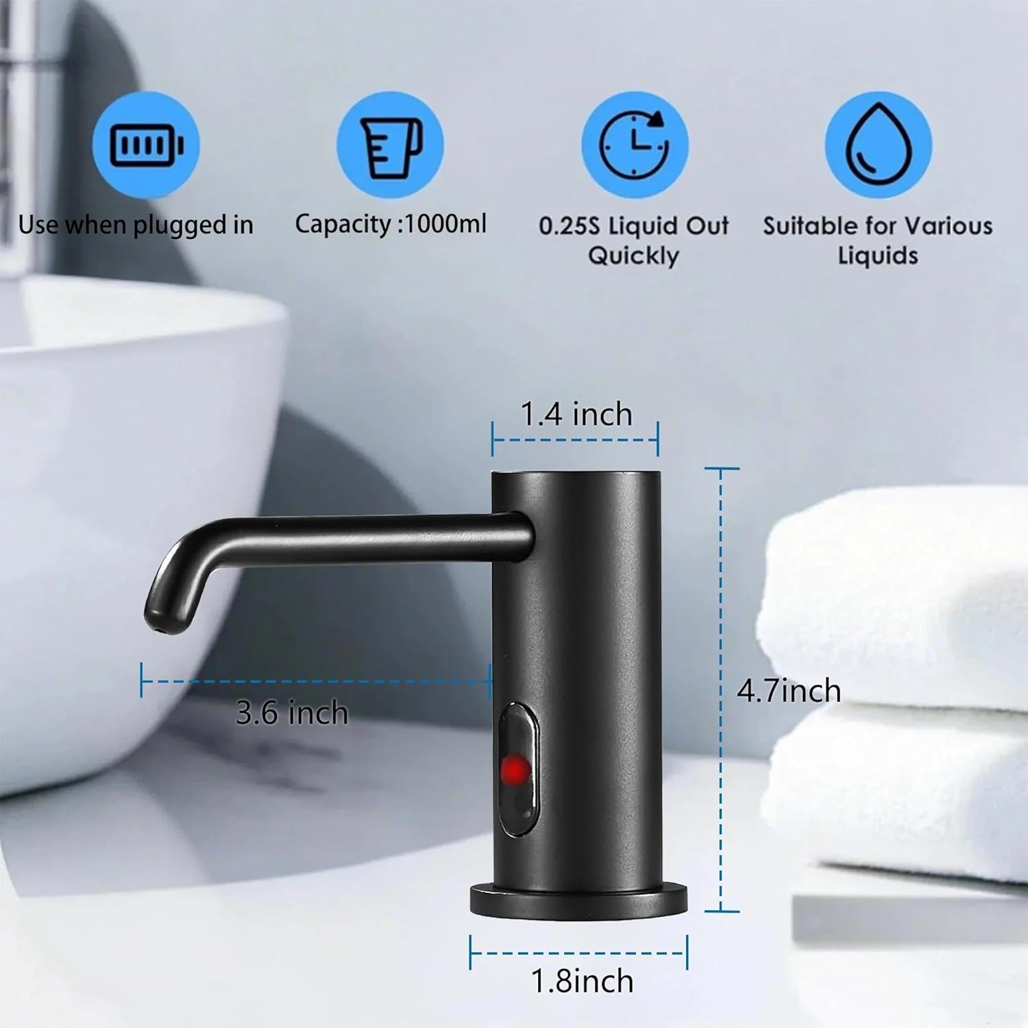 - Automatic Soap Dispenser:Touchless Soap Dispenser has a Highly Sensitive Infrared Sensor.What you need to do is put your hands under the sensing area and the intelligent soap dispenser will automatically release soap.You don't need to touch the soap dispenser, effectively avoid cross infection and enjoy a healthy life.
