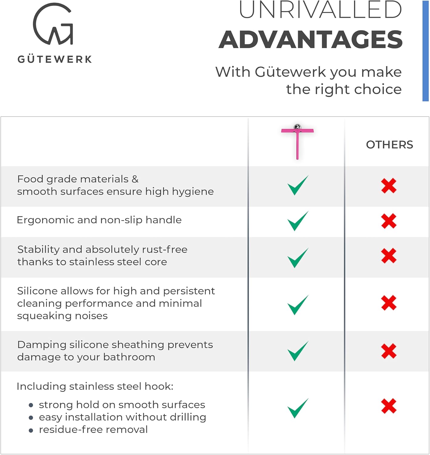- MINIMALIST TIMELESS DESIGN - The GÜTEWERK glass squeegee is crafted with a matte black finish that impresses with its elegant timeless and smart design. In addition, the chrome-colored stainless-steel hook integrates well with any modern bathroom.