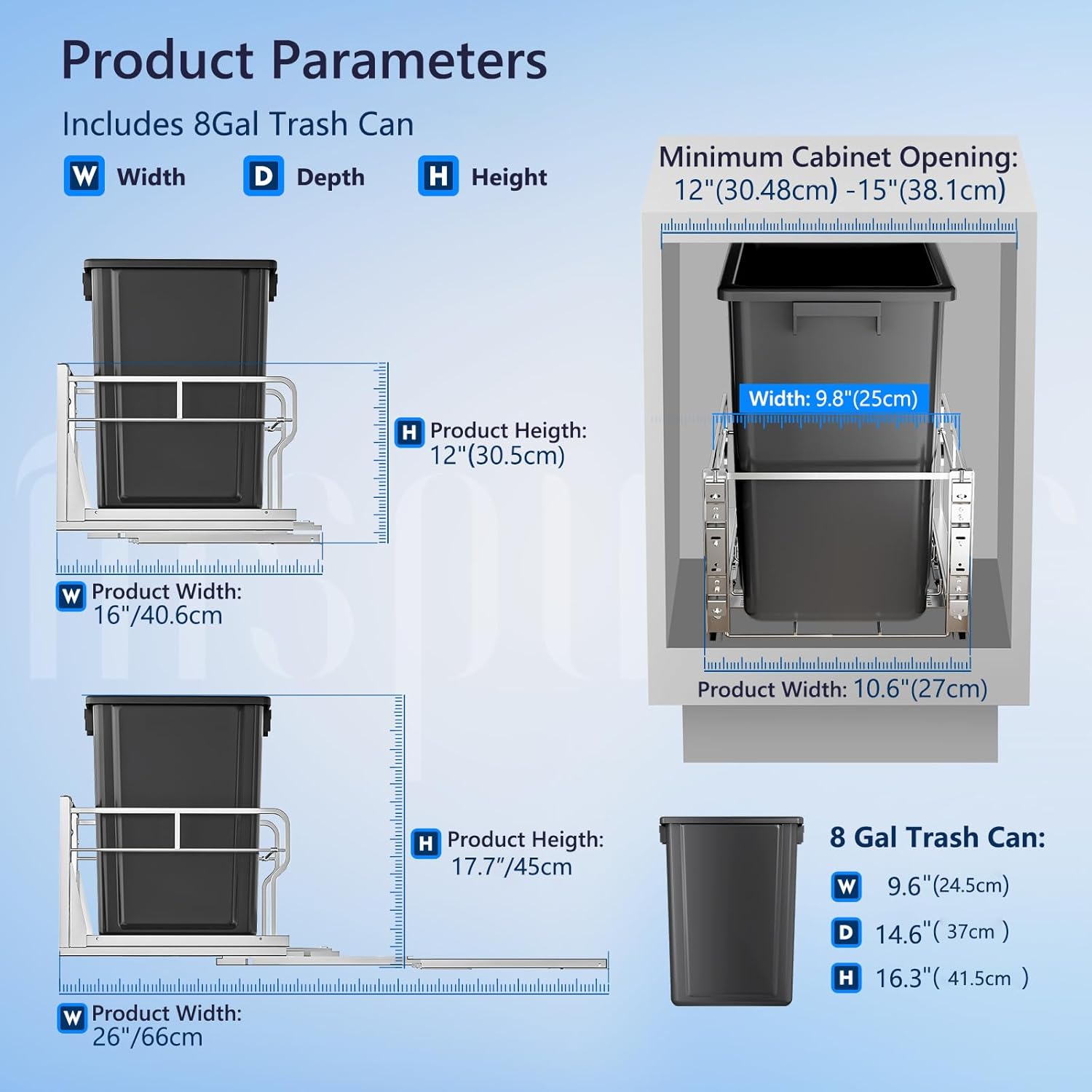 • Heavy Ducty Material: The pull out trash can under cabinet is made of heavy duty structural steel with surface nano-painting technology, which is more resistant to corrosion and rust than normal painting technology, and lasts longer. The under cabinet trash can pull out have enhanced weight capacity, which can withstand up to 100 pounds, no need to worry about bending the slides