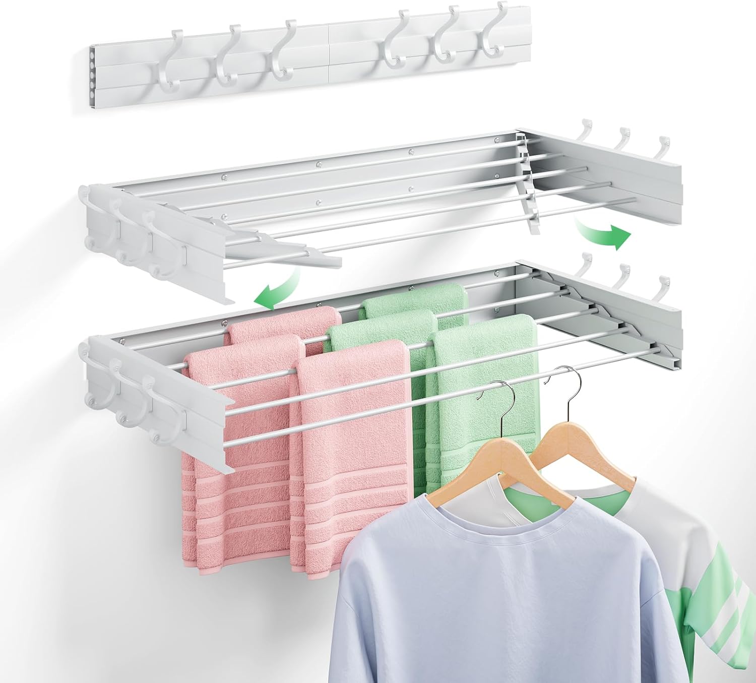 - 【Multiple Hanging Methods】Our added 6 hooks on the side of the wall mount drying rack, which has the advantage of providing extra hanging space, and the hooks can also hang anything when in folded state, which makes this drying rack wall mounted a good choice for limited space.