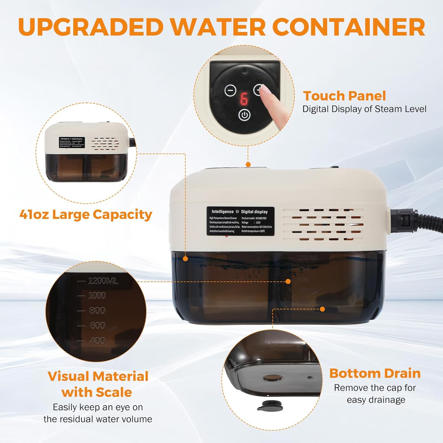 - **Easy to Operate: Simply fill the 1.2L (41oz) water container, turn on the switch, and adjust the steam output via touch panel or steam gun button. Features an LED digital display for precise control.