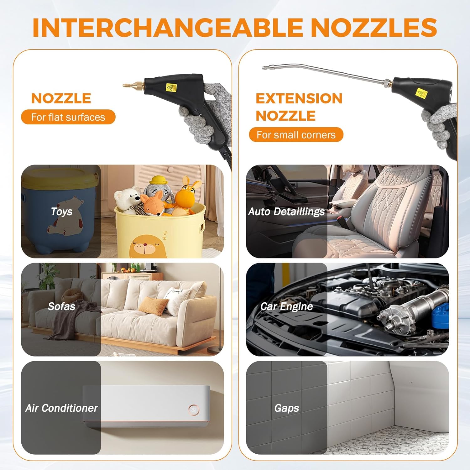 - **Portable & Flexible: Lightweight with a convenient handle for easy maneuverability. Extended power cord, water tube, and explosion-proof steam pipe provide a wide cleaning range.