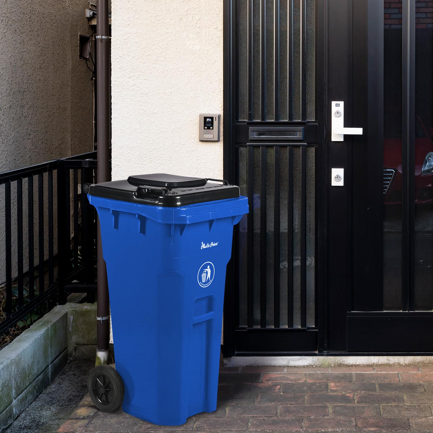 - Durable Construction: Crafted from high-density plastic, our 32 gallon recycling bin with wheels ensures durability and long-lasting performance, capable of withstanding heavy use and outdoor conditions.