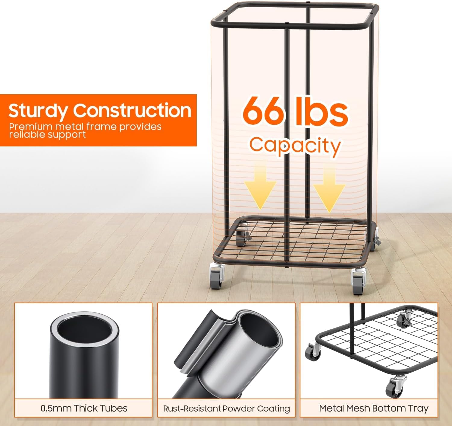 - ROBUST AND LONG-LASTING CONSTRUCTION--Designed for durability, our clothes hamper is supported by a high-quality metal frame capable of bearing up to 66 lbs without bending or warping. The frame is coated with a rust-resistant finish to ensure a prolonged lifespan, making it suitable for years of use in any household environment.
