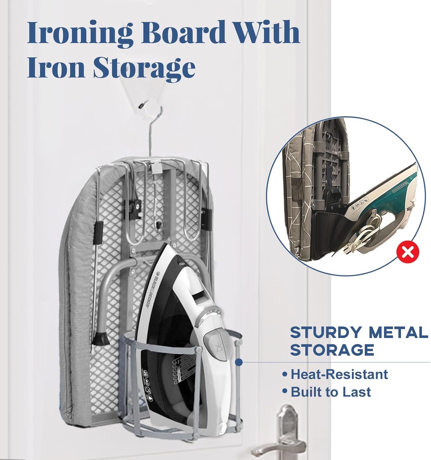 - Iron Storage: Features a metal iron holder to securely place your iron when not in use, keeping your ironing area neat and organized.