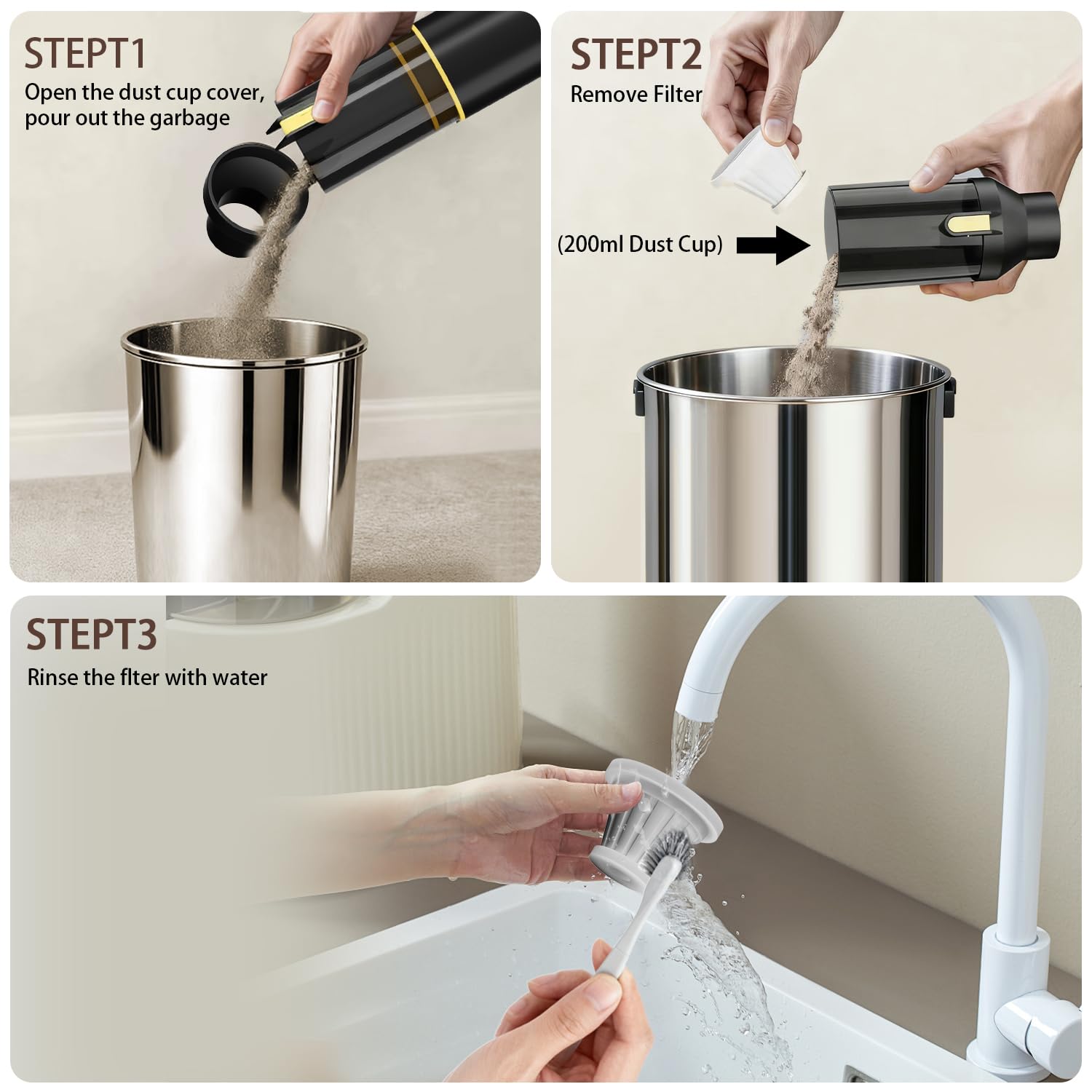 - Mess-Free Maintenance with Advanced Filtration: Empty the dust bin with one press—no touching dirt. The precision HEPA filter traps up to 95.99% of dust and particles, while the locking lid prevents spills during travel or storage. A reliable choice for anyone needing a clean and easy-to-maintain cordless car vacuum cleaner.
