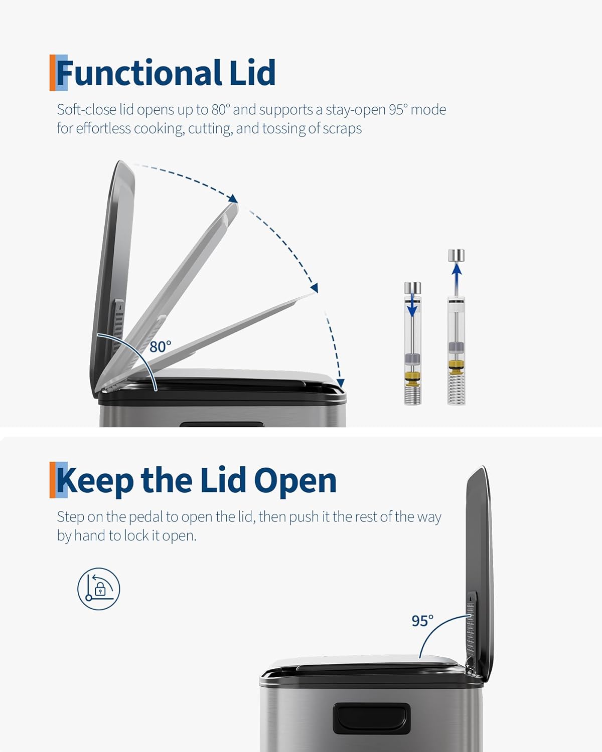 - [PRACTICAL DESIGN] β GarveeHome's dual trash and recycling bins put ease of use first. Ergonomic side handles let you lift and relocate the entire unit effortlessly. The soft-close lid opens to 80Β° without collision with standard kitchen island edges, and locks at 95Β° for hands-free cooking prep and scrap disposal. Dual inner buckets with weighted-edge lids trap odors separately. A custom liner ring secures any standard bag snugly, eliminating slips, bunching, and overhang