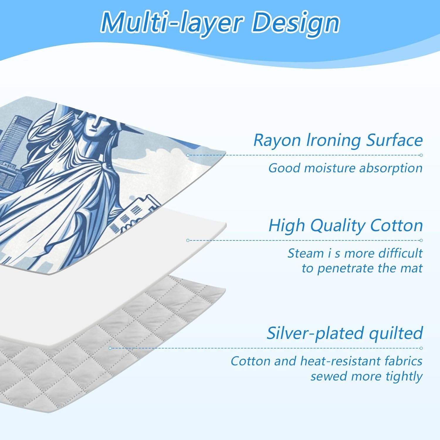 - Material: Our ironing mat for table top has 3 layers, rayon ironing surface + high quality cotton + silver-plated quilted fabric, making it durable to use