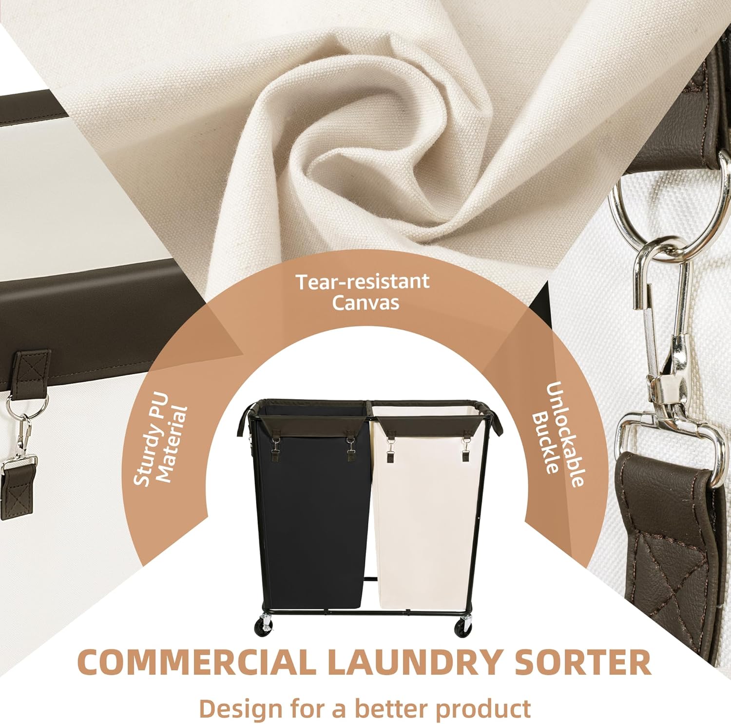 STORAGE MANIAC Commercial Laundry Hamper with Heavy Duty Steel Frame, 74 Gal. Industrial Laundry Basket Cart with Wheels for Hotel, Home, Laundry Room, Big Large Clothes Sorter, 2 Section Beige/Black