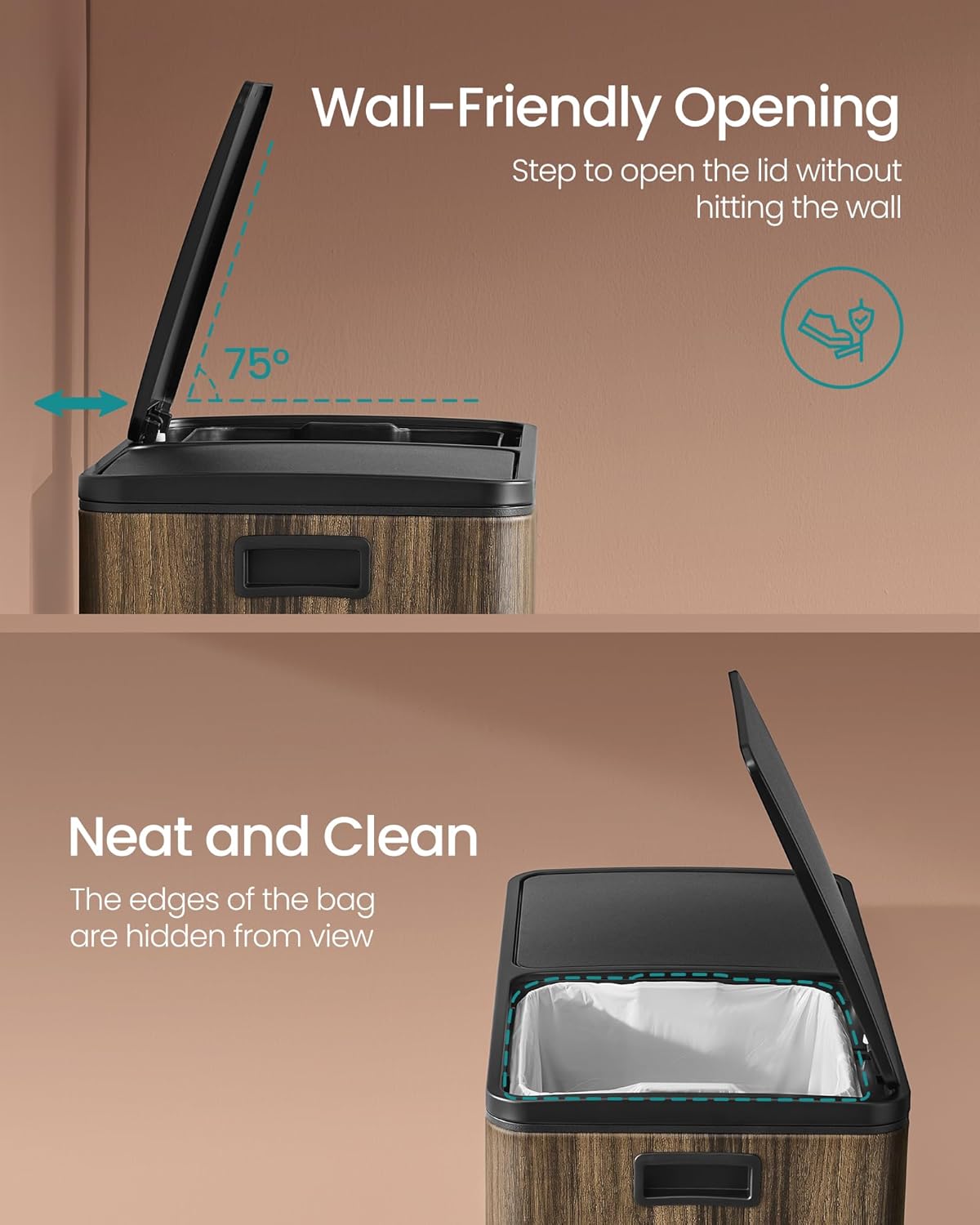SONGMICS Trash Can, 2 x 8-Gallon Garbage Can for Kitchen, with 15 Trash Bags, 2 Compartments, Plastic Inner Buckets and Hinged Lids, Airtight, Dark Walnut ULTB060N02V1