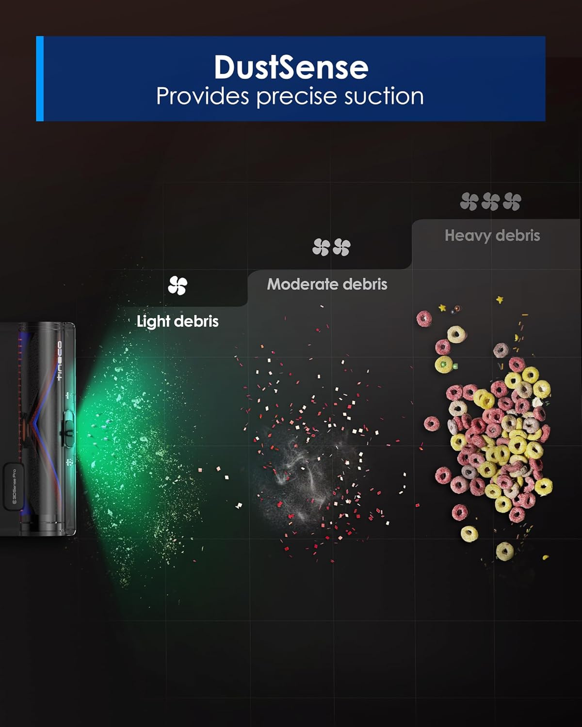 - 3DSense Pro Cleaning System: Powered by next-generation 3DSense Pro technology, this system delivers precise, targeted suction while detecting dust in real time. Advanced sensors instantly analyze the amount of debris on the surface, automatically adjusting suction power to match the cleaning needs