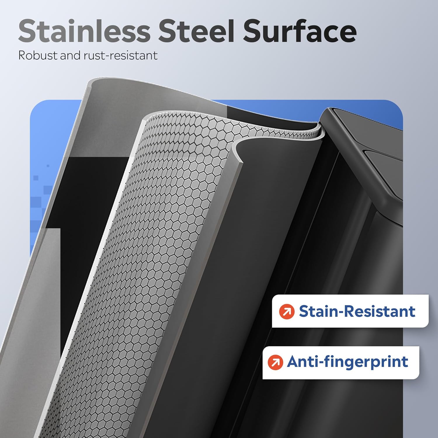 - ăQuiet & Durable DesignăEngineered for peace, the step trash can features dual soft-close hinges and rubber pads to prevent slamming and reduce noise. Made of sturdy stainless steel with metal hinges (no cheap plastic!), it resists fingerprints, stains, and daily wearâbuilt to last.