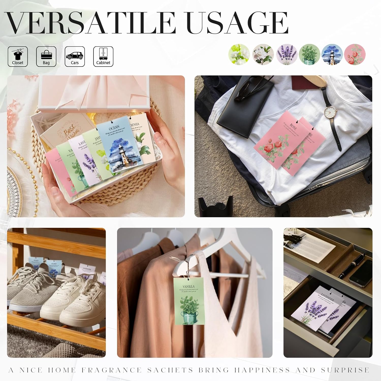 - 【Premium Long-Lasting Fragrance】Our scented sachets are designed to provide a consistent, pleasant aroma for 4-6 weeks when used in enclosed spaces. Each sachet contains carefully blended fragrances to refresh drawers, closets, and small areas.