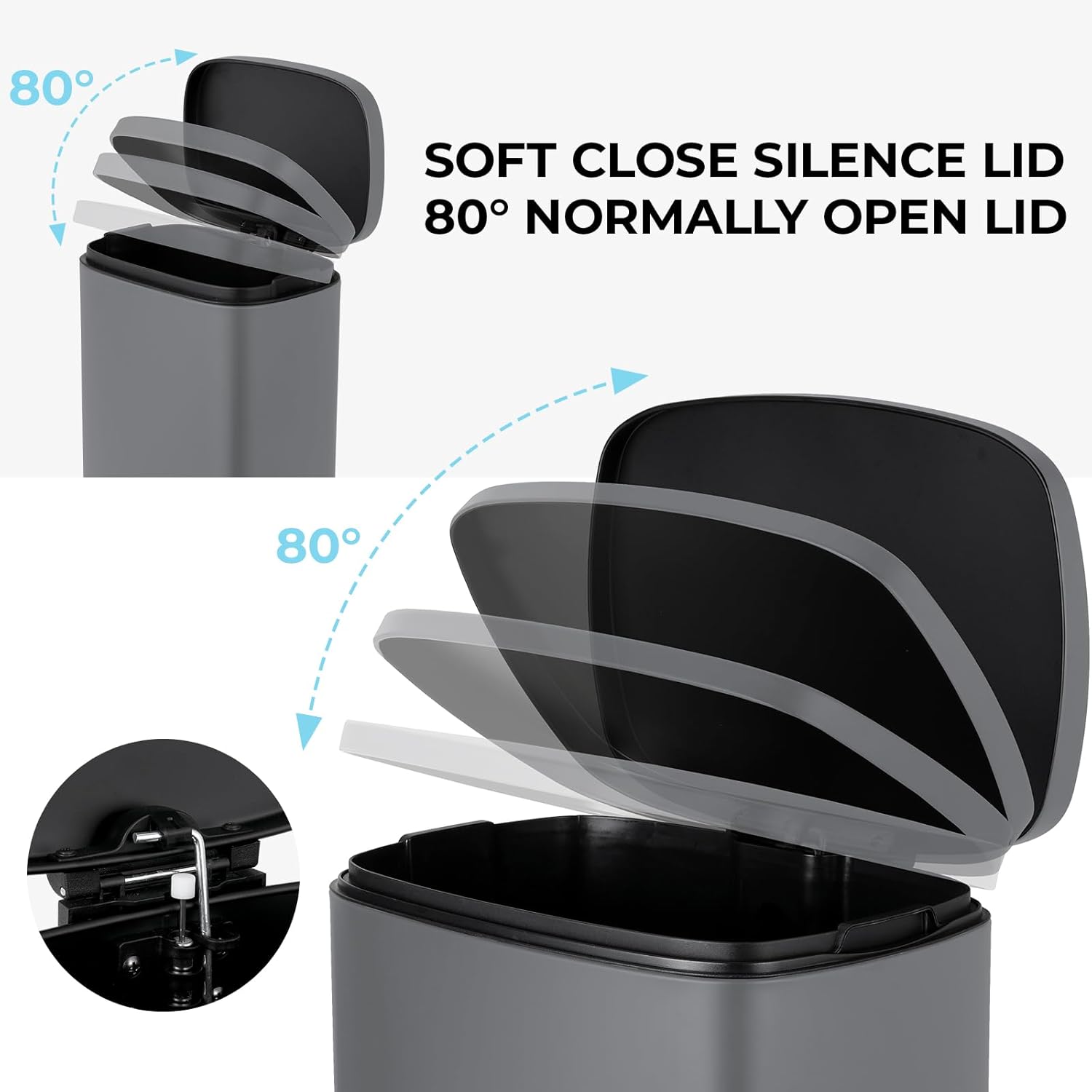 - Quiet Closing&Lid-lock: Heavy-duty garbage can is built with integrated step pedal mechanism and the force damper, which soft open and close lid while preventing slamming and banging. Lid-lock can help keep trash can open without stepping if you are inconvenient to keep stepping on pedal.
