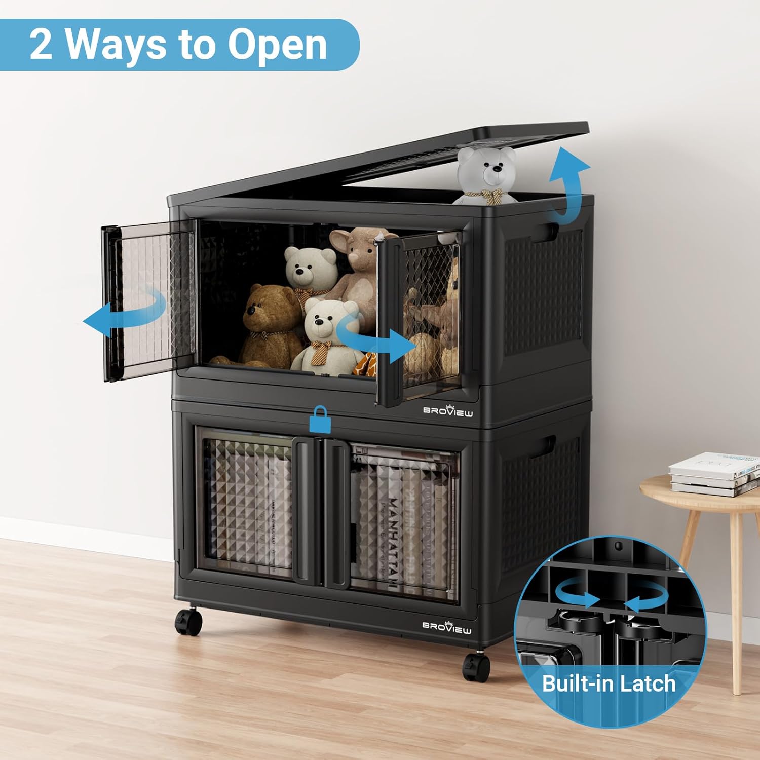 BROVIEW 600 Qt Stackable Storage Bins with Lids & Doors, 6 Pack Plastic Closet Organizer and Storage Drawers with Wheels, Large Collapsible Storage Boxes, Cabinet for Home, Office, V10, Black