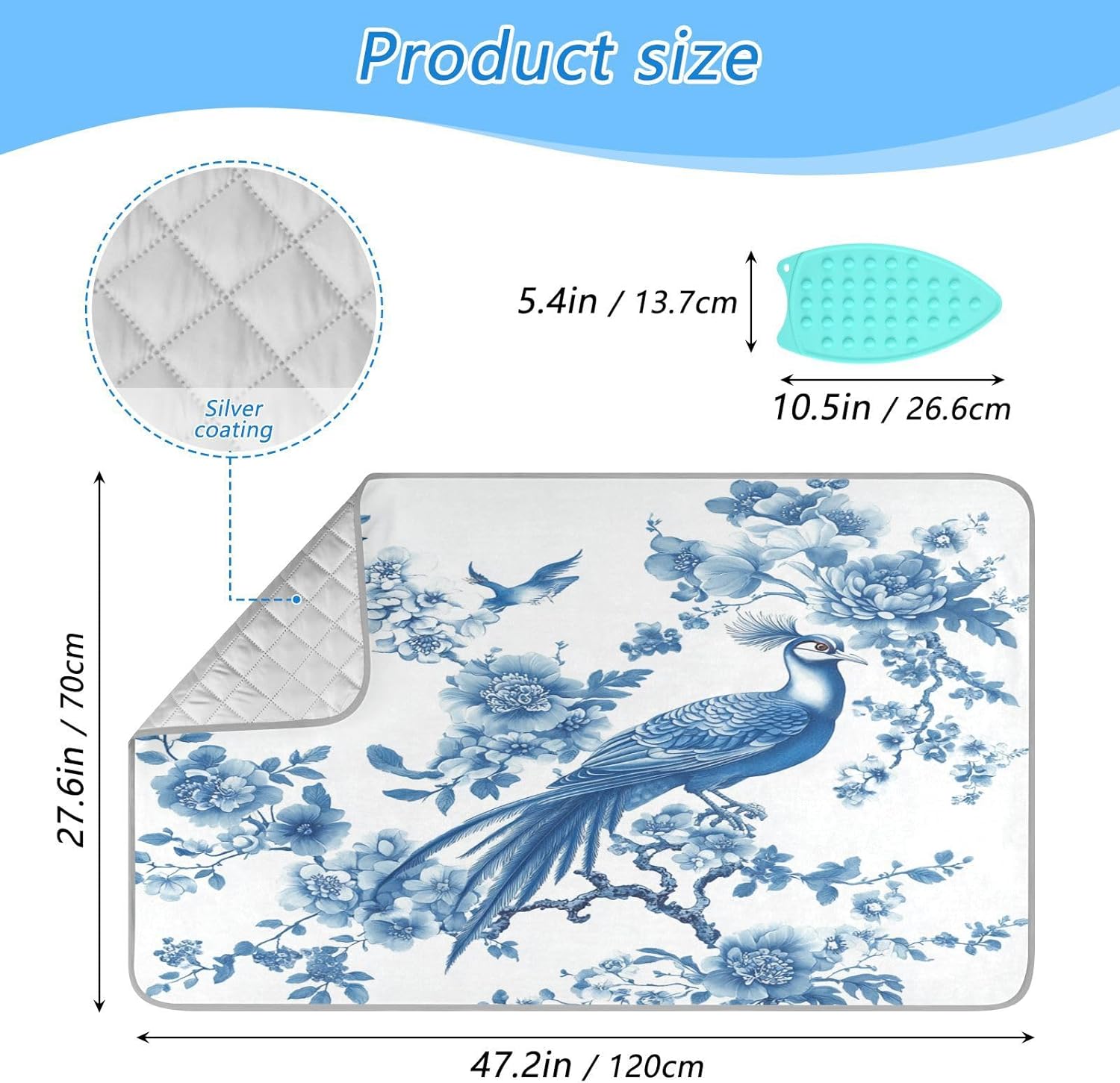 Chinoiserie Flower Peacock Ironing Mat Thickened Ironing Blanket Travel Portable Double-Side Using Ironing Pad Travel Isolate Heat Pad Cover for Washer Dryer Table Top Countertop 27.6x47.2in