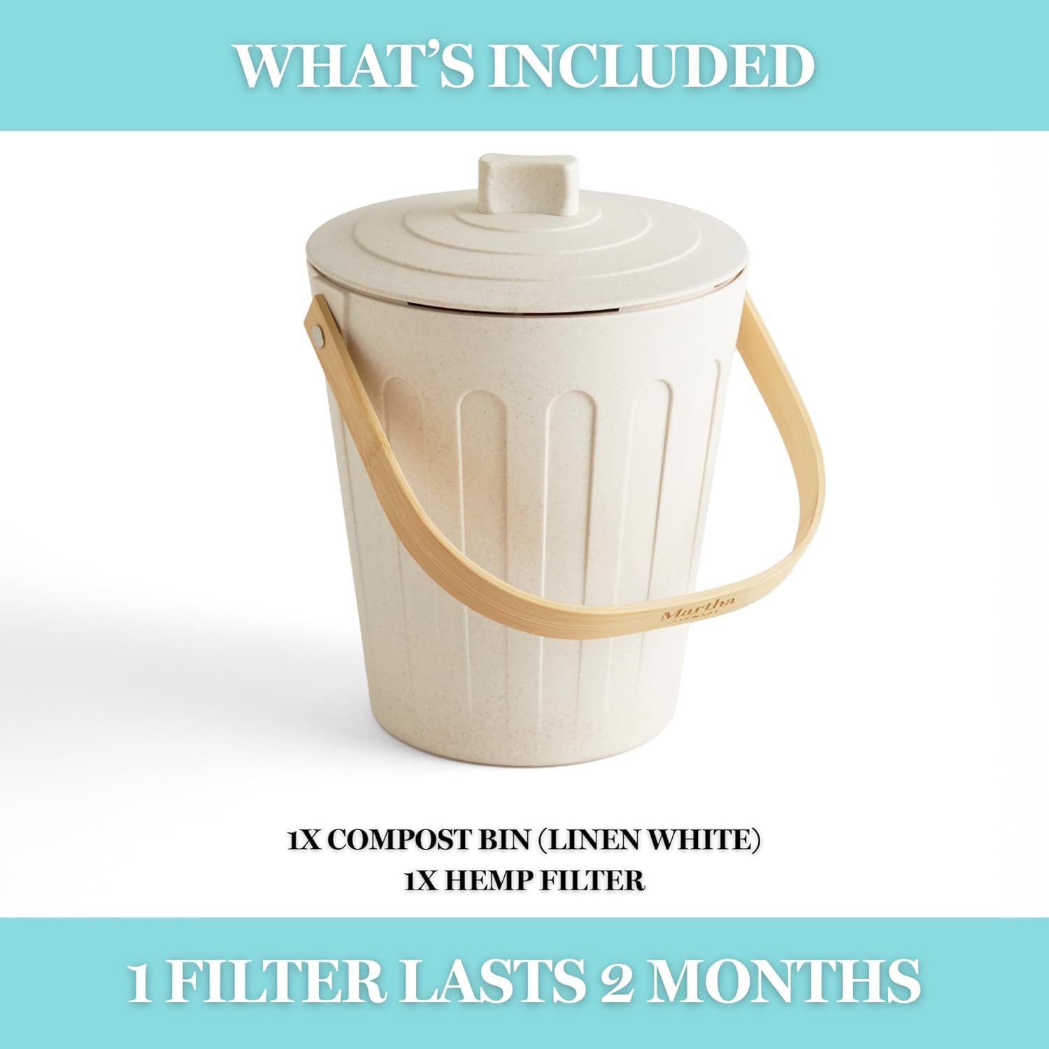 Martha Stewart Indoor Compost Bin | Countertop Composting Bucket for Kitchen | .7 Gallon Capacity | Includes Filter | Plant Based Materials | Linen White