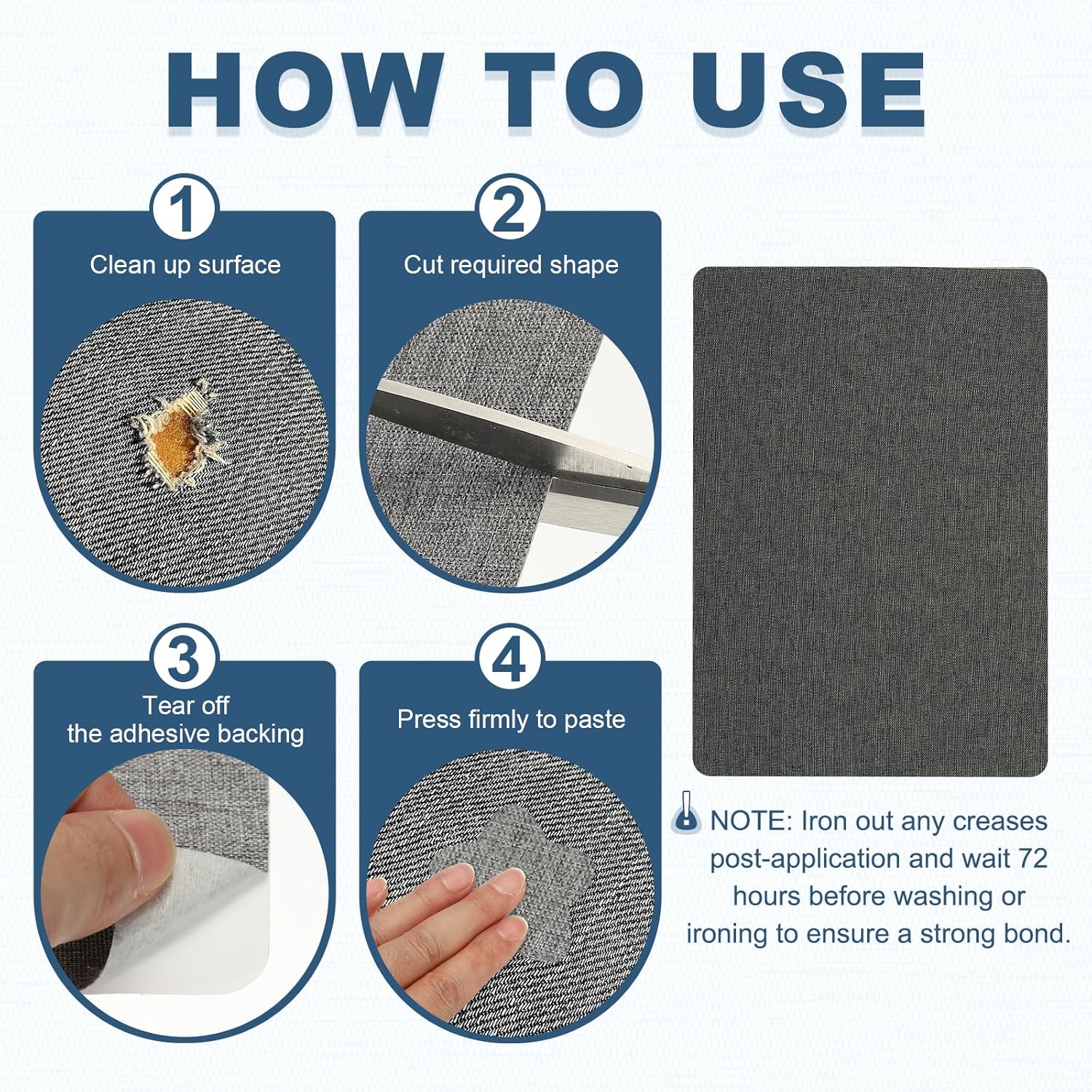 - Instruction: With the clothing patches for holes, customization is simple as you can cut it into any shape or pattern needed. Peel off the backing paper, apply it to the damaged area, focusing on corners and seams to prevent felting and curling.