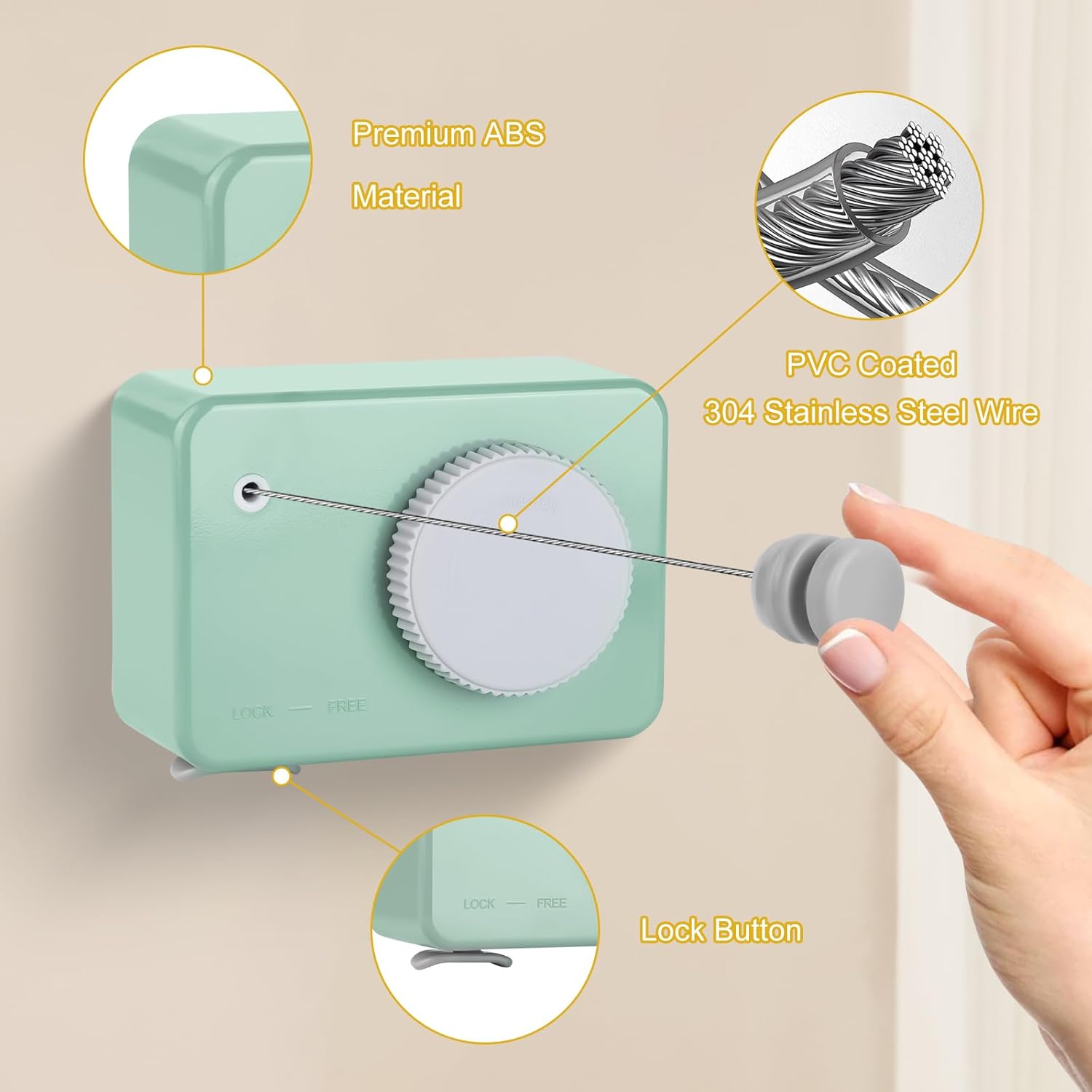 - The retractable laundry line is made of stainless steel wire and ABS plastic, with fine workmanship. It is compact and does not take up much space. It can be extended when needed and retracted when not in use.