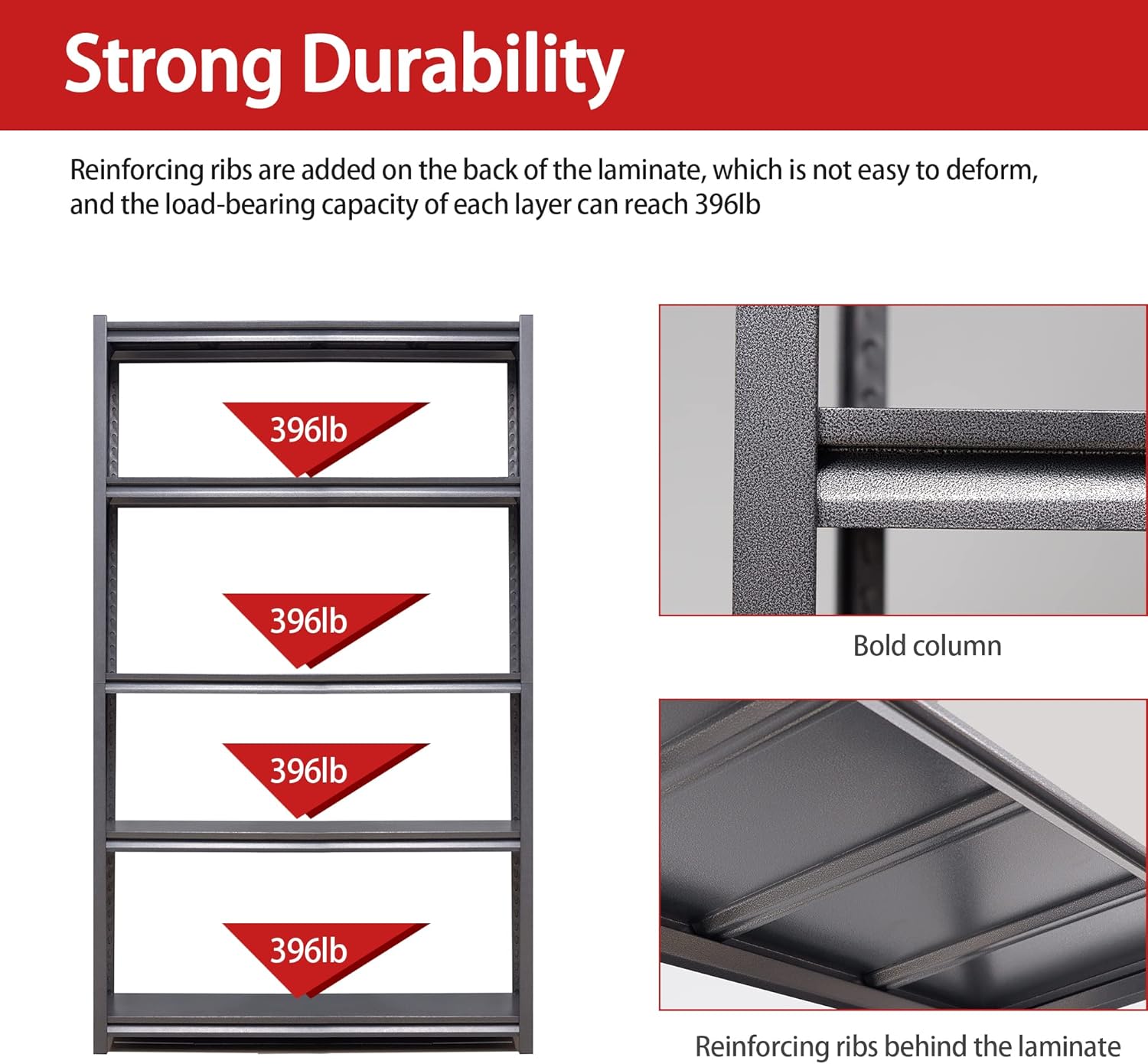 - 【Industrial-Strength Load Capacity】The garage shelf constructed with heavy-duty double-layer cold-rolled steel and reinforced design, each shelf boasts an impressive load capacity of 396lbs. Supports heavy toolboxes, car parts, storage bins, or office supplies with unwavering stability – no wobble, just reliable strength.
