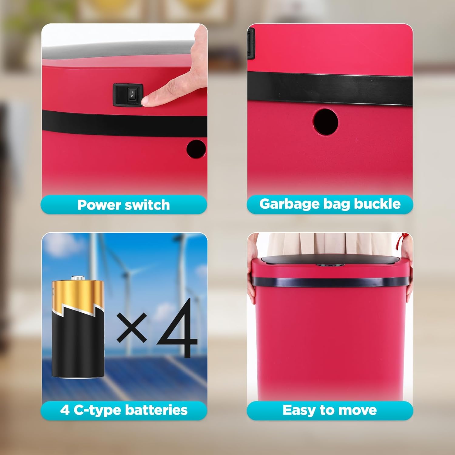 Automatic Motion Sensor Bathroom Trash Can with Lid, 13 Gallon Touchless Trash Bin, Smart Dog Proof Garbage Can, Touch Free Waste Basket for Toilet, Office, Bedroom,Red,2