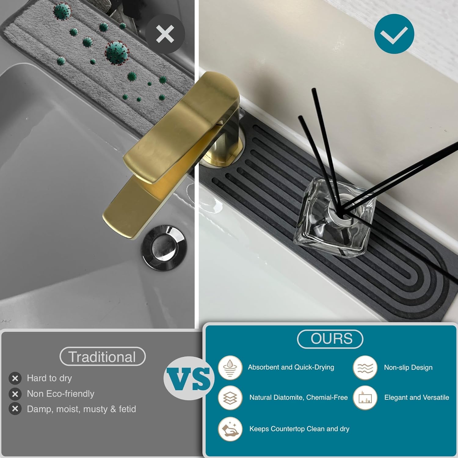 - Drying Fast: Our Faucet mat for kitchen sink is crafted from natural diatomacues earth. The diatomite stone's small holes enable amazing water absorption, quickly soaking up splashes and self-drying within minutes. Say goodbye to annoying drips and keep everything dry.