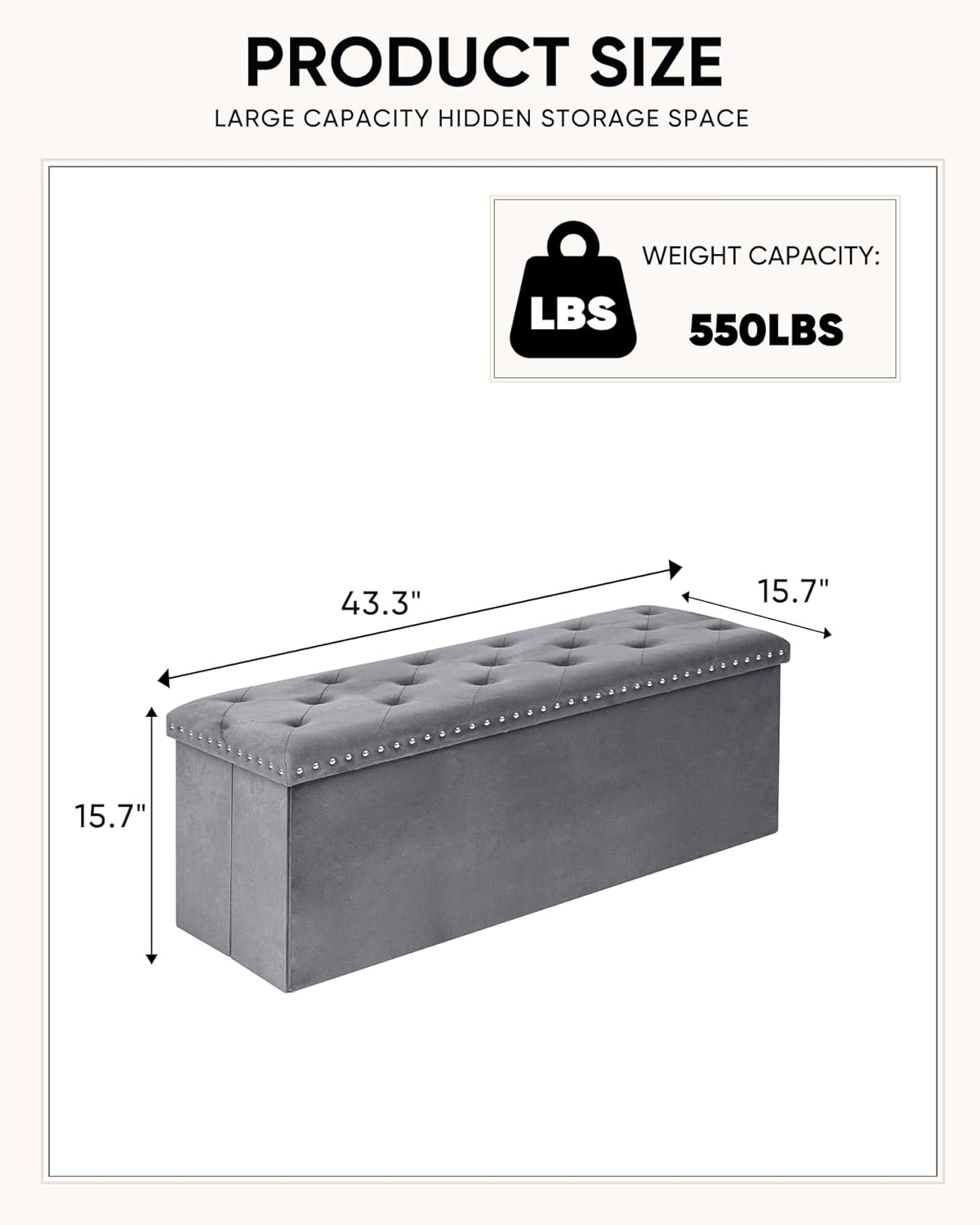 - Elegant Design with Rivet Detail: Our spacious storage ottoman bench is crafted from skin-friendly velvet fabric that feels soft to the touch. The extra rivet trim adds a touch of sophistication, making it a perfect accent piece for your home decor