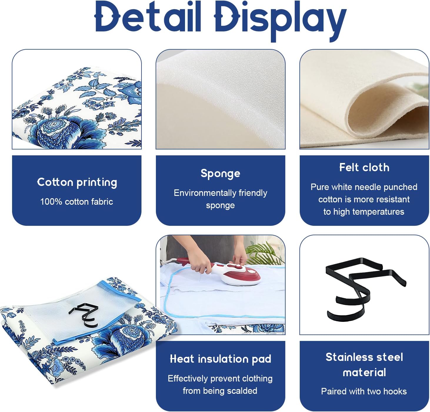 - Quality:Features pure cotton printed fabric laminated to a 3mm fiber pad for soft, efficient ironing. The scorch-resistant fabric prevents discoloration, while the padded core protects tables or beds from heat damage, allows full steam penetration, and retains warmth for faster wrinkle removal.Please do not use this product on expensive desktops or surfaces.