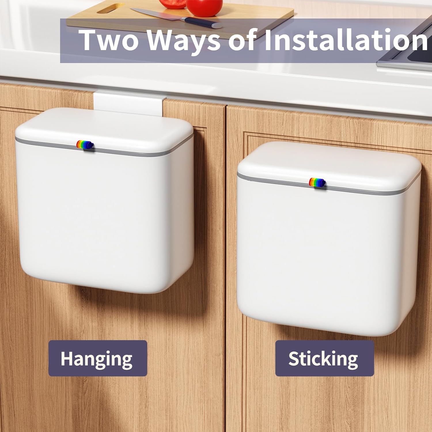 - ăVersatile UsesăThis waste bin has three usage methods: hanging, adhesive-mounted, and freestanding. It can perfectly fit most cabinet doors and is suitable for under the sink, on the countertop, kitchen, bathroom, living room, bedroom, RV, office, and any other scenes where you want to use it.