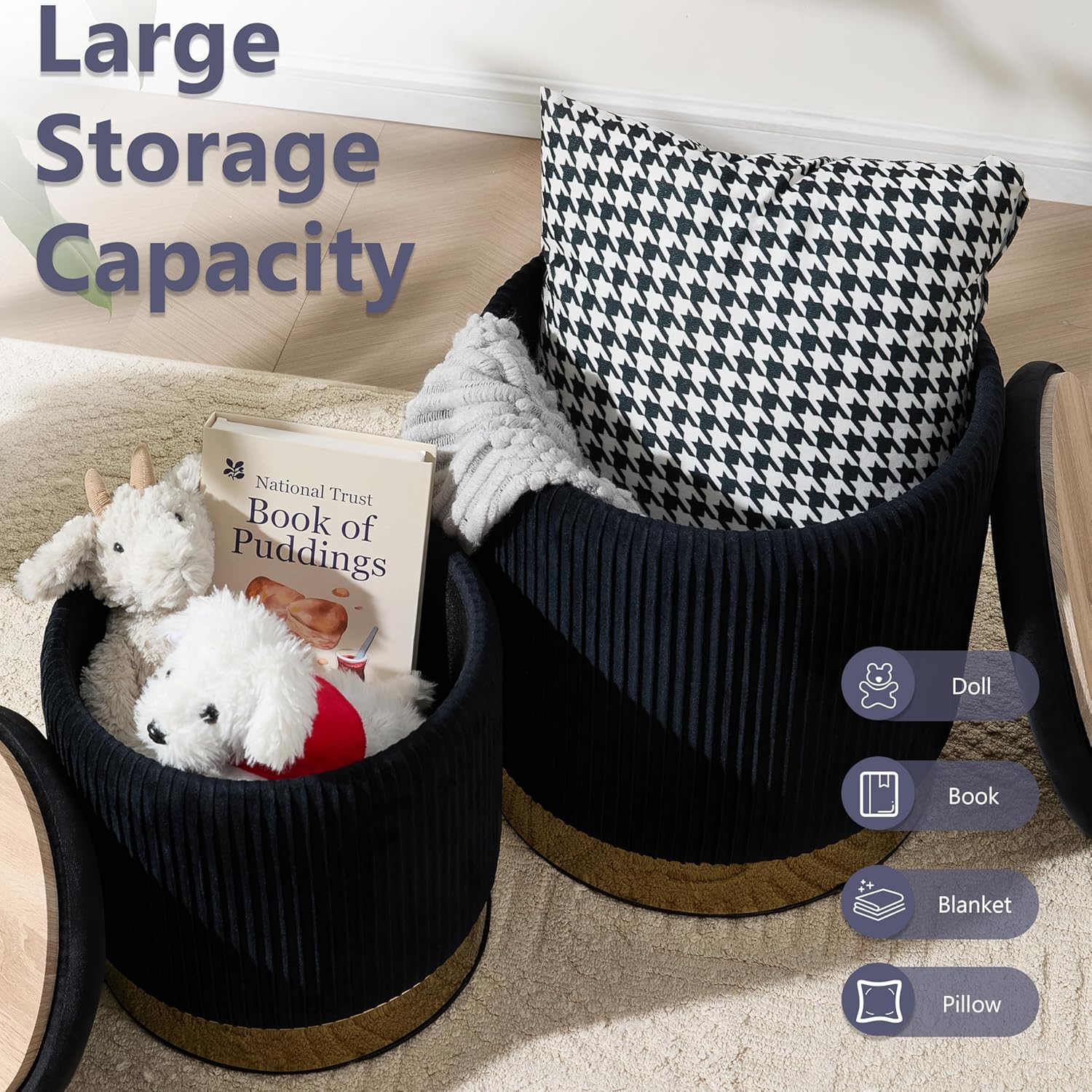 - ăAmple & Versatile Storage CapacityăEnjoy generous storage space in both the large and small ottomans. Ideal for stowing away shoes, blankets, toys, magazines, or accessories. Their versatile functionality allows them to serve as a footrest, extra seating, a vanity stool, or even as a side table with the reversible tops.