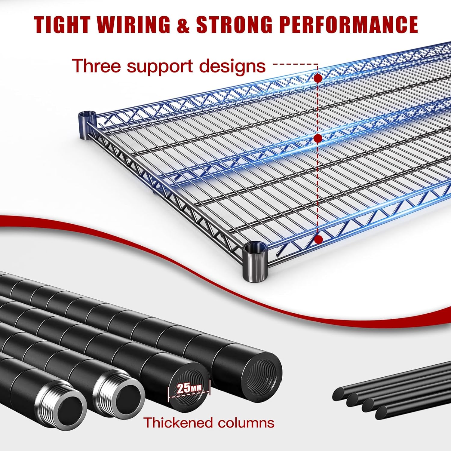 - Powerful Performance - Heavy duty shelving is constructed with five layers of wire shelving and four 25.7mm diameter metal rods. Each layer of wire shelving is more tightly woven than other wire racks on the market. Each layer metal shelving has a load capacity of 700 pounds, for a total load capacity of 3,500 pounds.