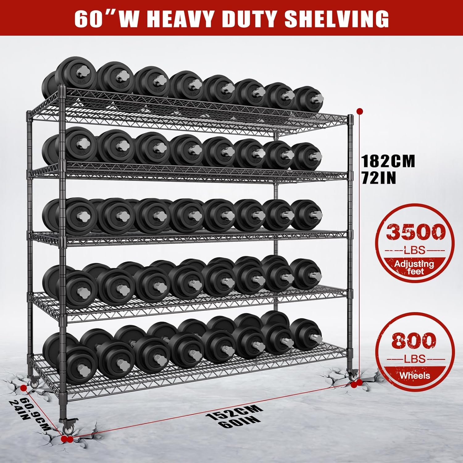 AIRAJ 60” W Storage Shelves Heavy Duty | 5 Tier Wire Shelving | 3500 LBS Metal Shelving | Garage Shelving Units and Storage | Rolling Wire Rack with Wheels | Adjustable Layer Height | 60”W×24”D×72” H
