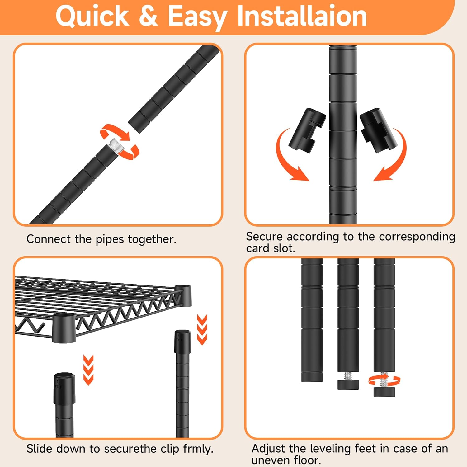 - HEAVY DUTY STORAGE SHELF: Our storage shelf is made of study high-quality carbon steel and metal rods and each shelving unit holds up to 660LBs on leveling feet, with a total bearing capacity of 3300LBs