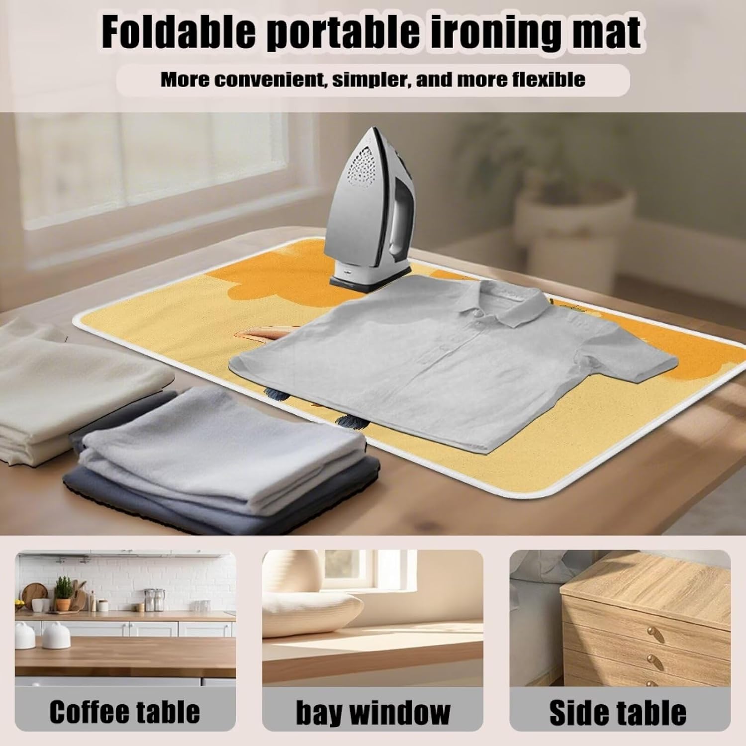 - 【Foldable】: Say goodbye to bulky ironing boards! This lightweight mat folds flat to the size of a magazine, making it ideal for studio apartments, dorm rooms, RVs, or tiny homes. Use it on any sturdy surface—kitchen tables, dressers, or even the bed—and store it in a closet, drawer, or under the bed when not in use